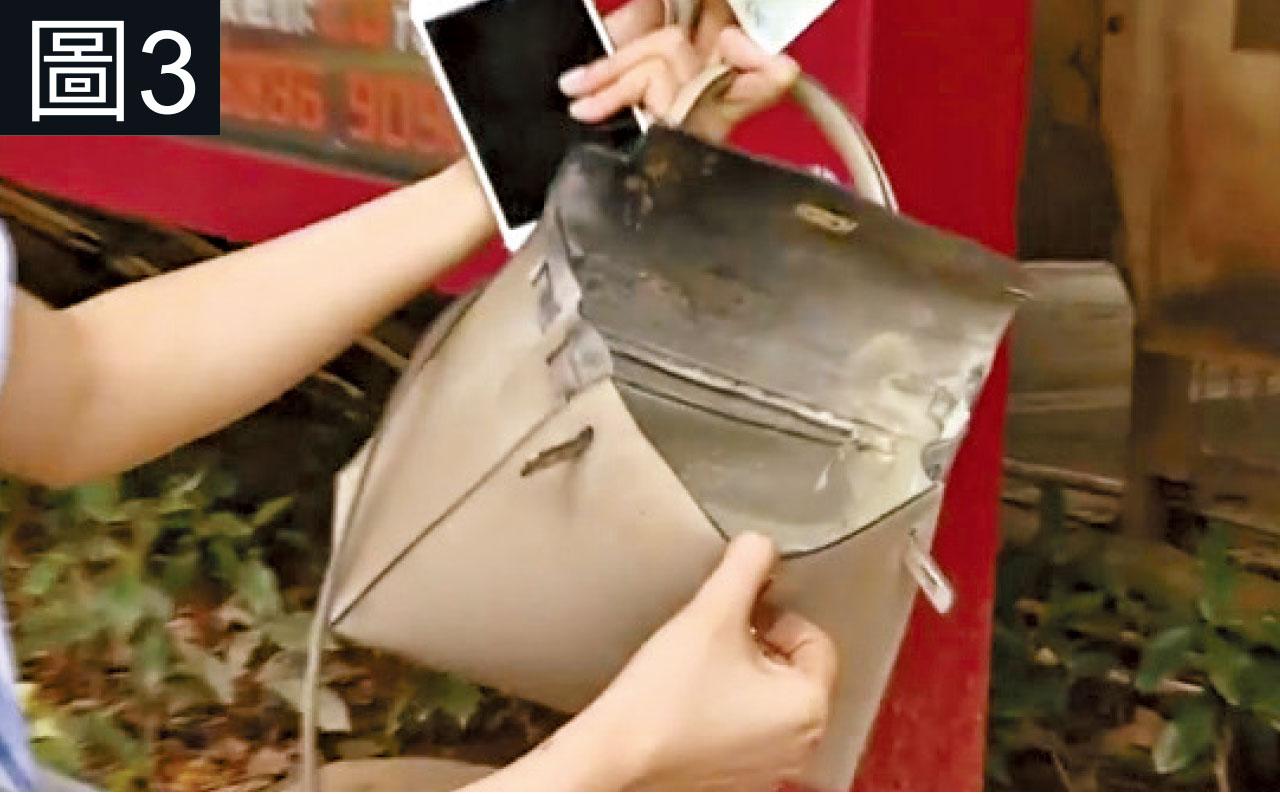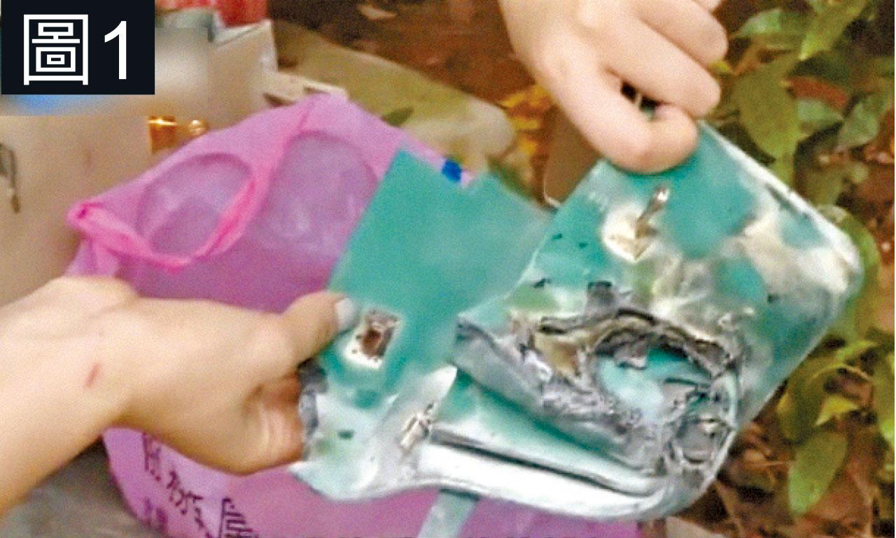 內地又有「尿袋」(流動充電器)在充電時自燃,深圳韓女士日前使用從淘寶網購買的充電器為手機充電,並將兩者放在價值十多萬元(人民幣,下同)的Hermès Kelly手袋內,詎料充電器突然冒出火花,韓女立即丟開手袋,沒有受傷,但手袋內價值兩萬多元的Hermès Kelly銀包(圖1)、手機殼及3條車匙等物品(圖2)均燒毀,手袋薰黑(圖3),充電器則燒成焦炭(圖4)。