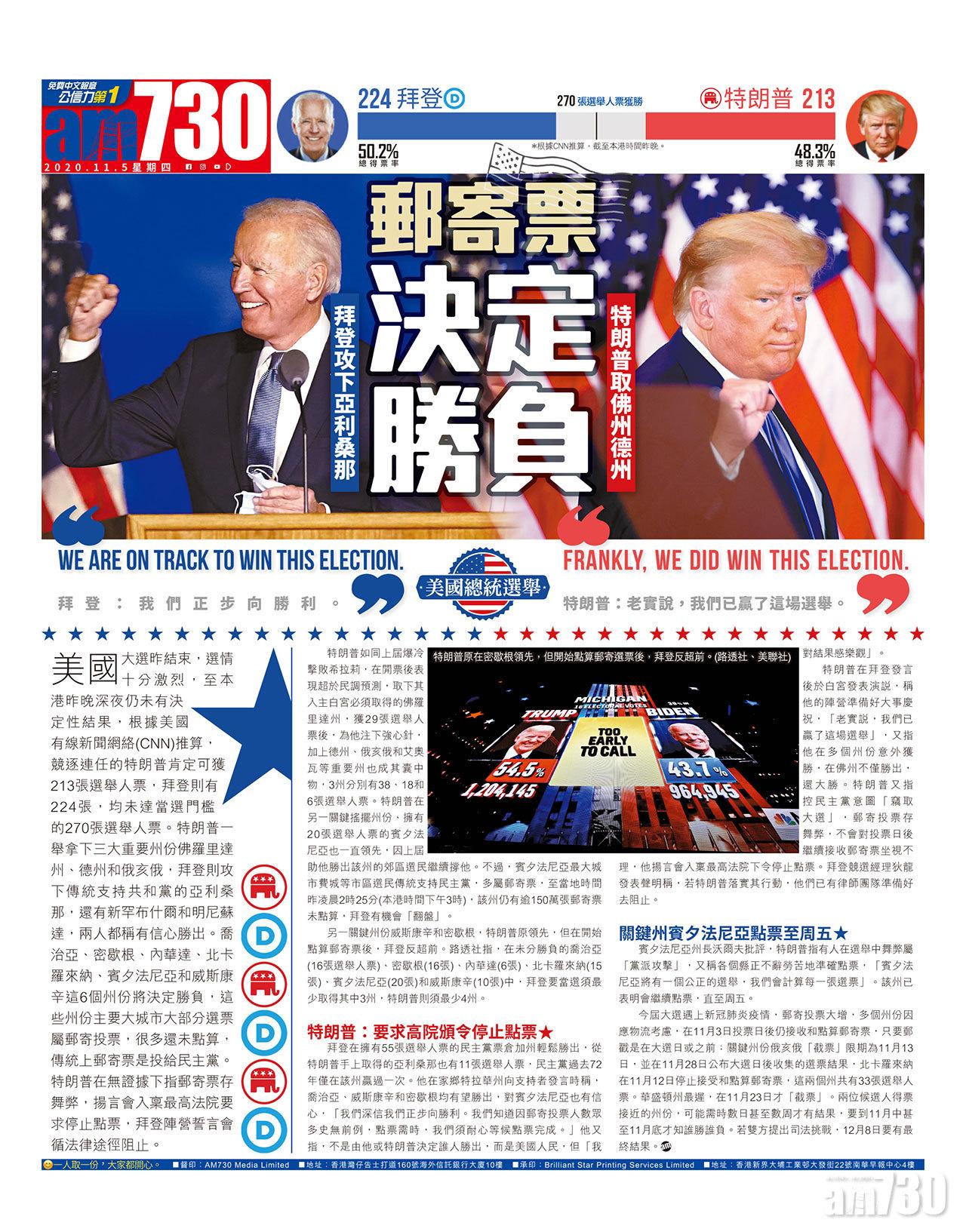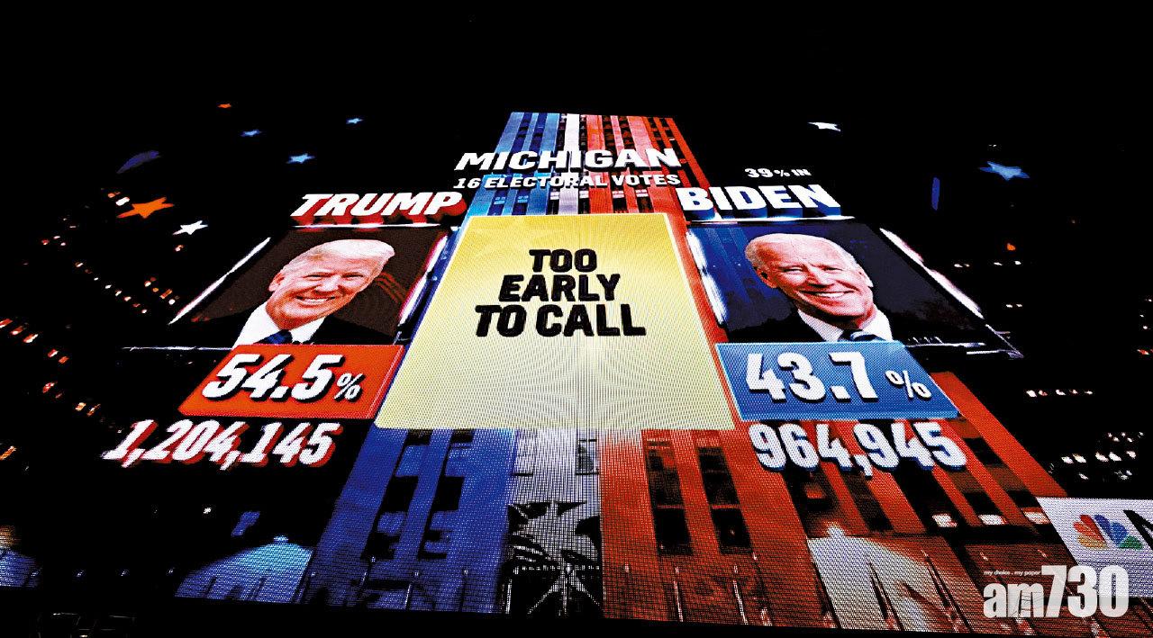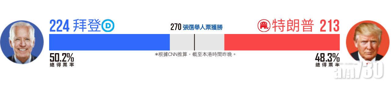 美國大選昨結束,選情十分激烈,至本港昨晚深夜仍未有決定性結果,根據美國有線新聞網絡(CNN)推算,競逐連任的特朗普肯定可獲213張選舉人票,拜登則有224張,均未達當選門檻的270張選舉人票。特朗普一舉拿下三大重要州份佛羅里達州、德州和俄亥俄,拜登則攻下傳統支持共和黨的亞利桑那,還有新罕布什爾和明尼蘇達,兩人都稱有信心勝出。喬治亞、密歇根、內華達、北卡羅來納、賓夕法尼亞和威斯康辛這6個州份將決定勝負,這些州份主要大城市大部分選票屬郵寄投票,很多還未點算,傳統上郵寄票是投給民主黨。特朗普在無證據下指郵寄票存舞弊,揚言會入稟最高法院要求停止點票,拜登陣營誓言會循法律途徑阻止。
