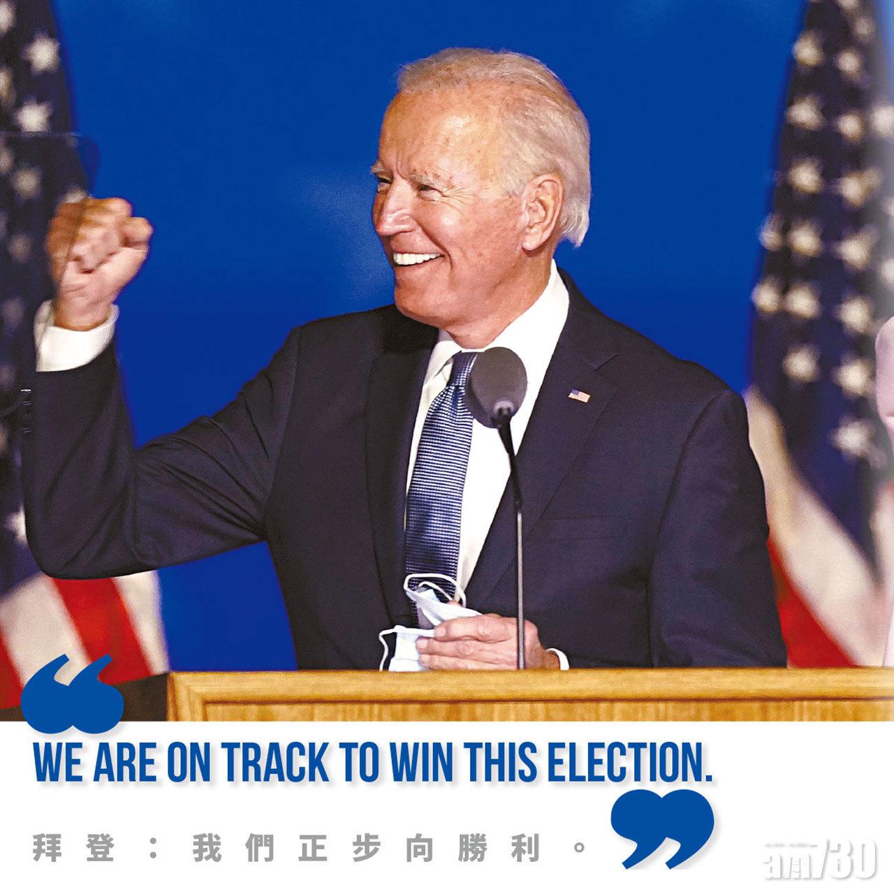 拜登在擁有55張選舉人票的民主黨票倉加州輕鬆勝出,從特朗普手上取得的亞利桑那也有11張選舉人票,民主黨過去72年僅在該州贏過一次。他在家鄉特拉華州向支持者發言時稱,喬治亞、威斯康辛和密歇根均有望勝出,對賓夕法尼亞也有信心,「我們深信我們正步向勝利。我們知道因郵寄投票人數眾多史無前例,點票需時,我們須耐心等候點票完成。」他又指,不是由他或特朗普決定誰人勝出,而是美國人民,但「我對結果感樂觀」。