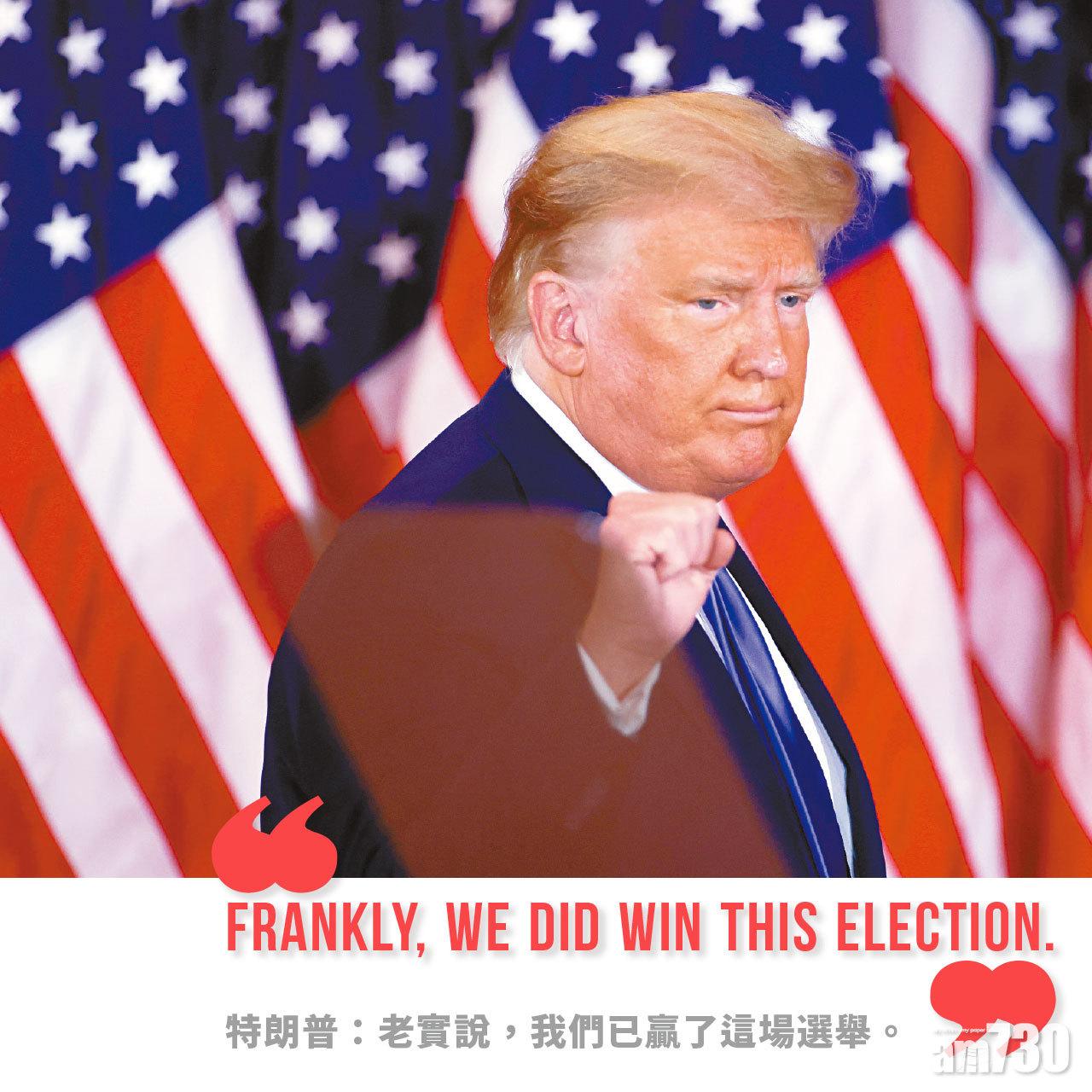 特朗普在拜登發言後於白宮發表演說,稱他的陣營準備好大事慶祝,「老實說,我們已贏了這場選舉」,又指他在多個州份意外獲勝,在佛州不僅勝出,還大勝。特朗普又指控民主黨意圖「竊取大選」,郵寄投票存舞弊,不會對投票日後繼續接收郵寄票坐視不理,他揚言會入稟最高法院下令停止點票。拜登競選經理狄龍發表聲明稱,若特朗普落實其行動,他們已有律師團隊準備好去阻止。