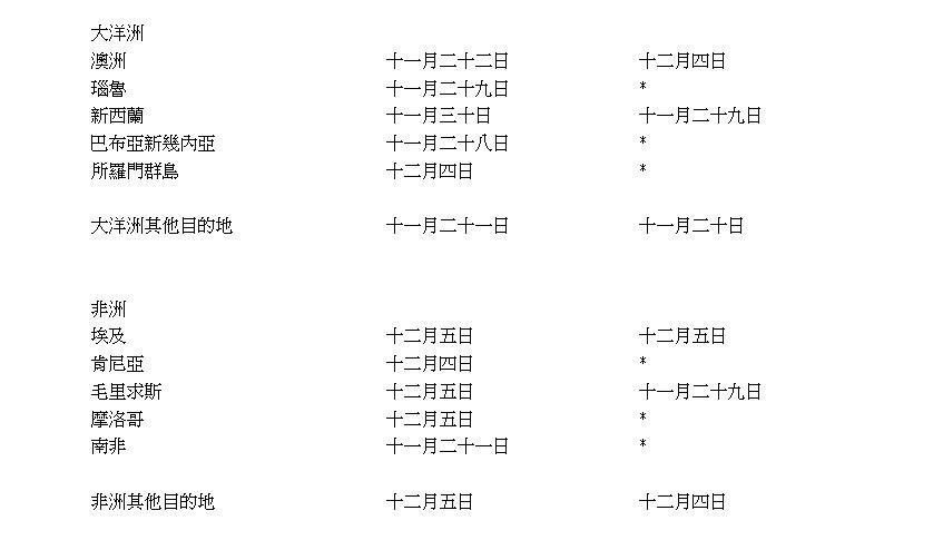 香港郵政今日(1日)宣佈今年的聖誕空郵截郵日期,而有關日期是根據各目的地郵政機關的要求而臨時訂定作為參考資訊,確實日期及服務或會受當時的空運服務所影響,並可能會於短時間通知後予以更改。