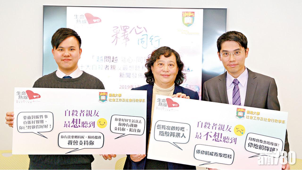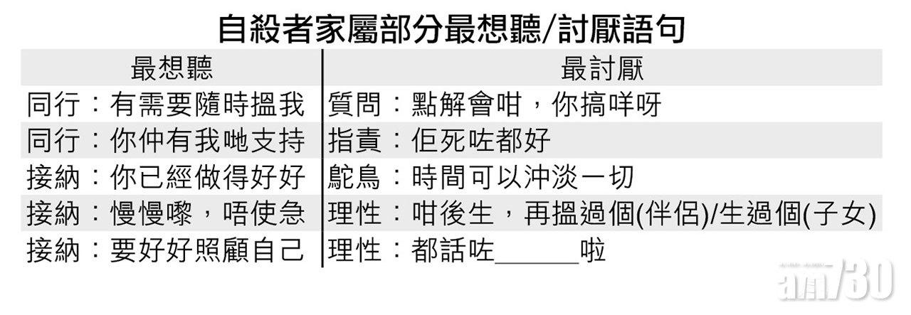 「節哀順變。」看似得體的安慰,卻是自殺者家屬討厭聽到的說話之一。生命熱線與港大合作,研究自殺者家屬在事後,最希望及最討厭聽到的說話,歸納分析較想聽說法為「同行派」,最討厭則為「質問派」。報告並引述美國研究指,自殺個案平均影響6至10個親友,他們之後自殺的機率亦比常人高逾3倍。