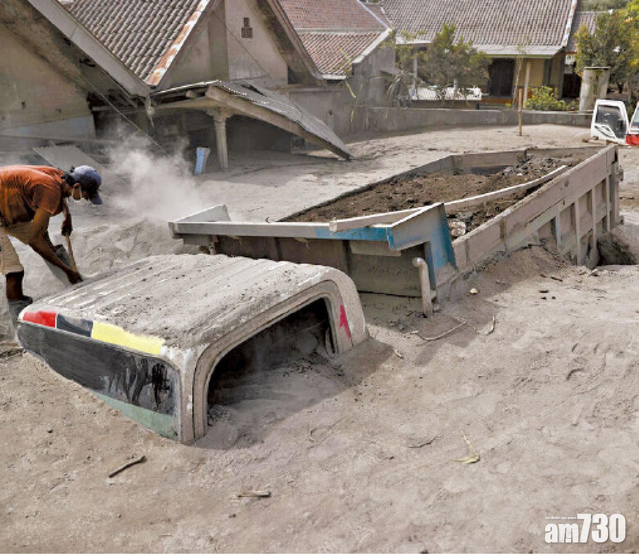 卡車被火山灰掩埋。