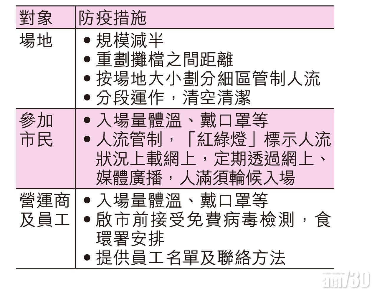不足兩周前宣布取消的年宵花市,當局在疫情反覆及多區爆疫下昨宣布如期舉行。花市維持原有15個場地,但全港原來約一千檔攤位將減半,視乎場地大小,劃分區域,例如維園可劃分成4區,以便管理人流。每區出入口設紅外線儀器,檢測入場人士體溫及點算人數,並上載數據至網上供市民參考。場地亦會提供酒精搓手液及嚴格執行其他防疫措施,包括設「安心出行」場地碼,供使用應用程式掃碼記錄行蹤。食物環境衛生署署長劉利群形容以「紅綠燈」標示人流狀況,但稱每個場地面積不一,具體人數需與相關部門個別商討。當區域人流達預設人數上限,會標示為紅色,她表示,雖然花市設有「等候區」,但冀透過發放資訊,市民合作避免到人滿的花市,稱「不希望用到等候區」。而等候區亦須保持社交距離。