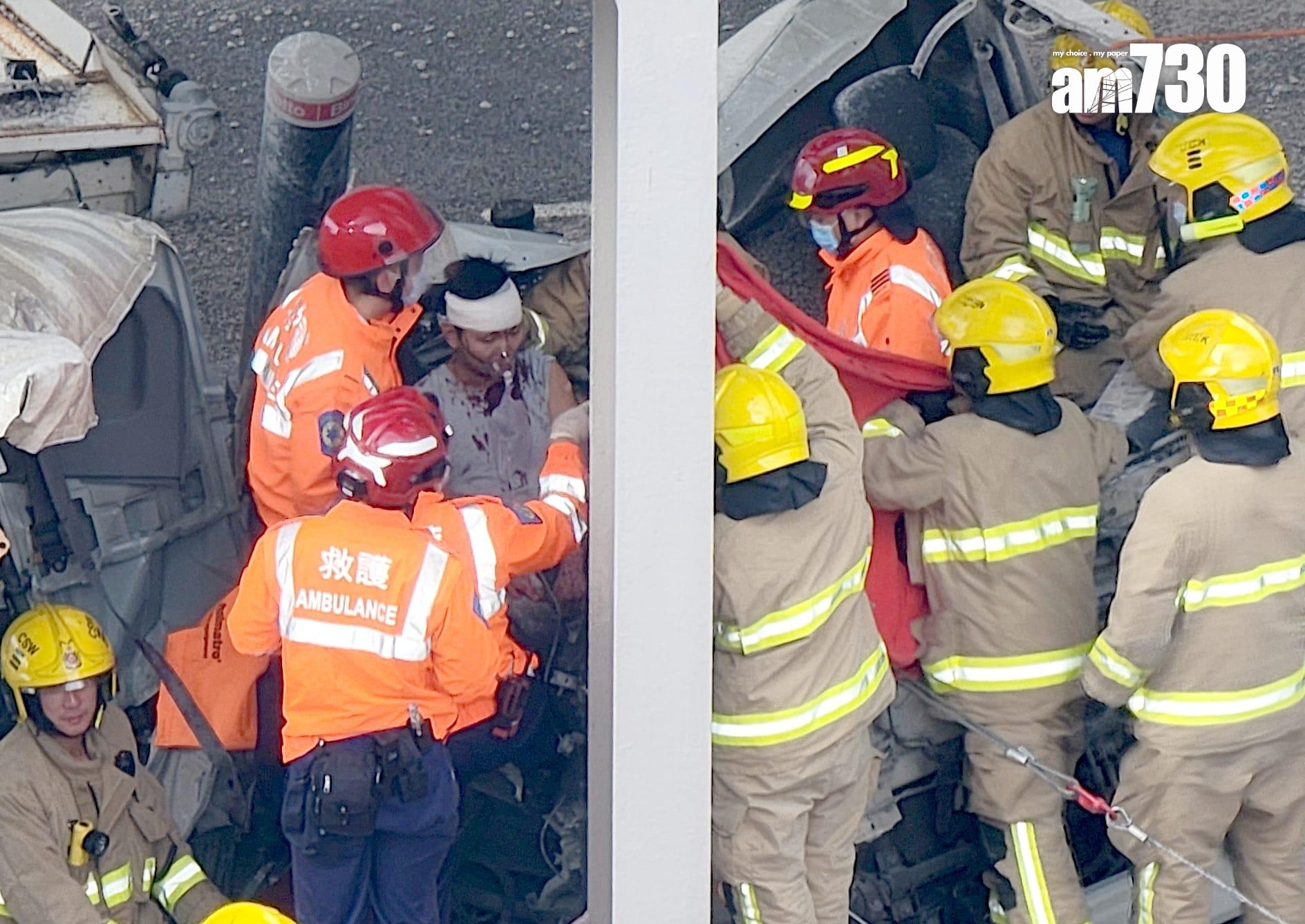 荔枝角青沙公路泥頭車撼法拉利後撞壆,司機頭傷被困 。(鍾式明 攝)