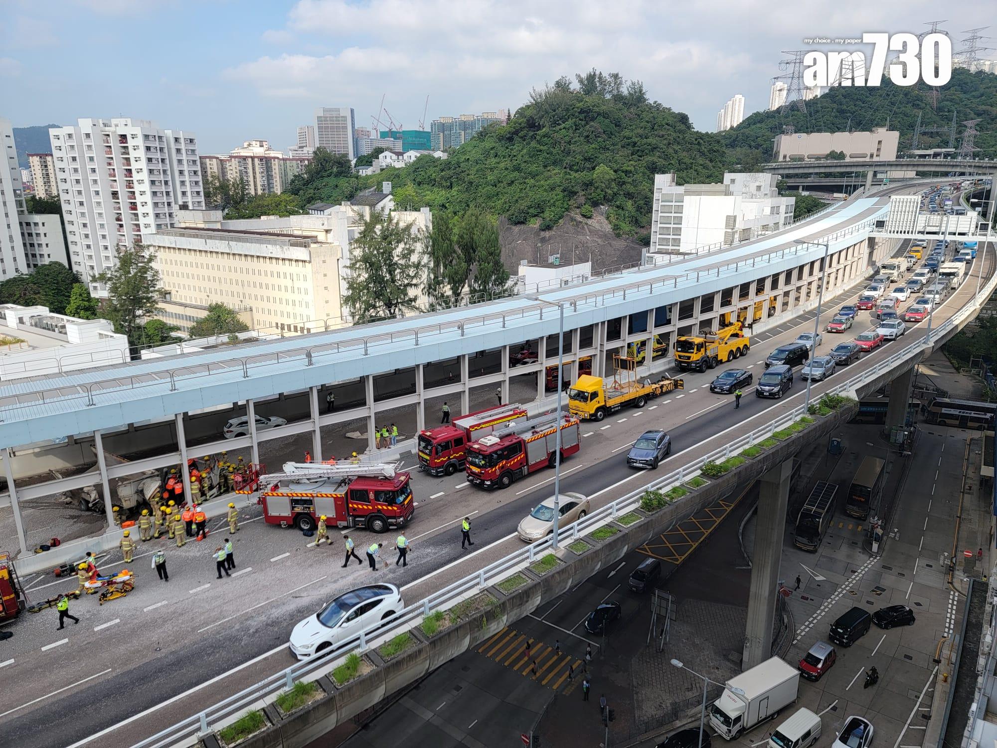 今日(3日)早上8時許,荔枝角青沙公路天橋往沙田方向、近荔枝角懲教署位置,一輛泥頭車與一輛法拉利相撞,泥頭車繼而失撞撞石壆,車頭嚴重毀爛,司機被困。