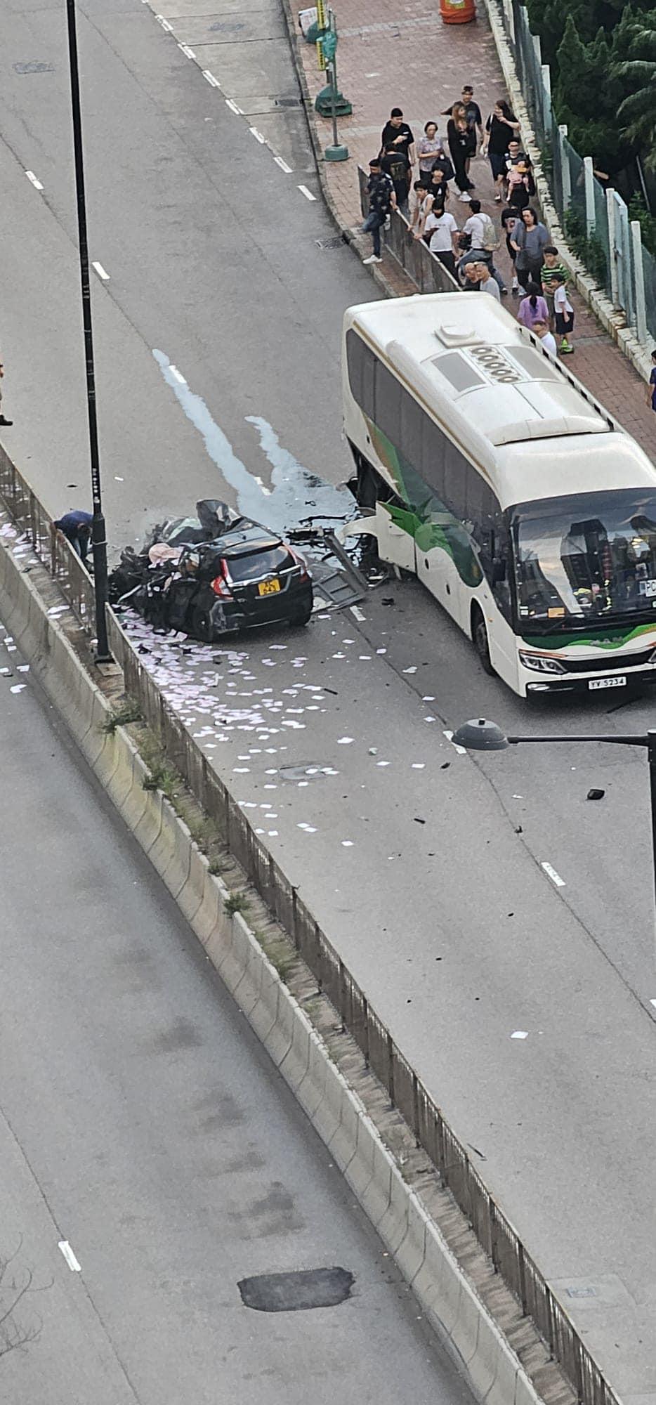 葵涌興芳路發生嚴重交通意外,其中私家車車頭嚴重損毀。今日(10日)傍晚近7時,一輛私家車往葵興行駛時,與一輛旅遊巴相撞。由網上圖片可見,私家車車頭嚴重損毀,旅遊巴右後方位置亦同告損毀,馬路上滿布車油。警方正調查車禍原因。