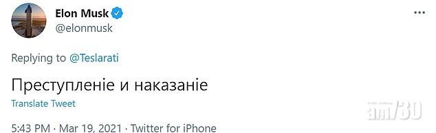 馬斯克在Twitter以俄文留言,意思是「罪與罰」。(互聯網)