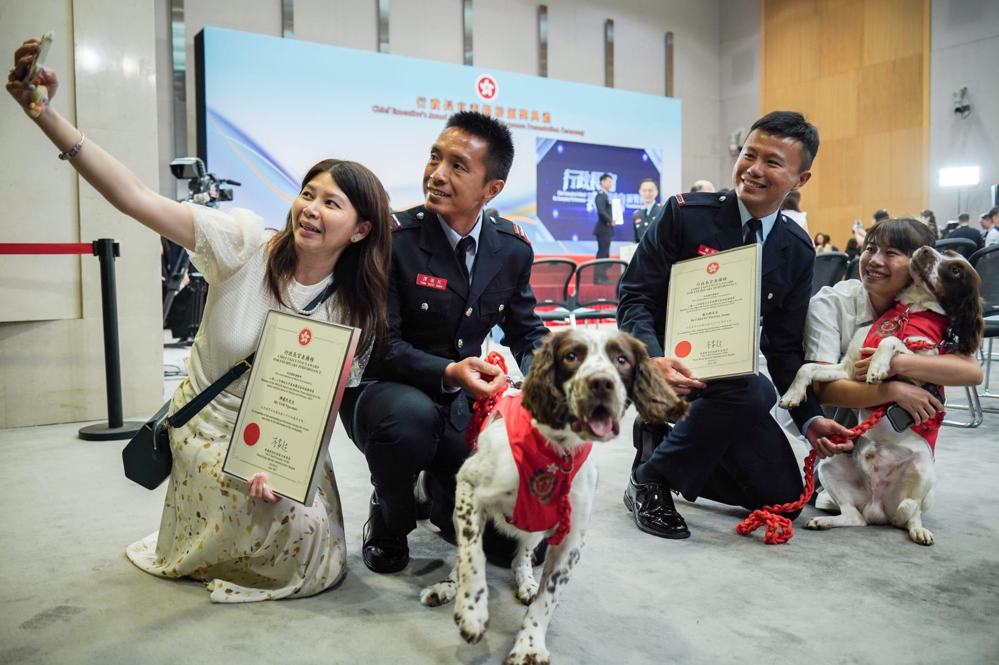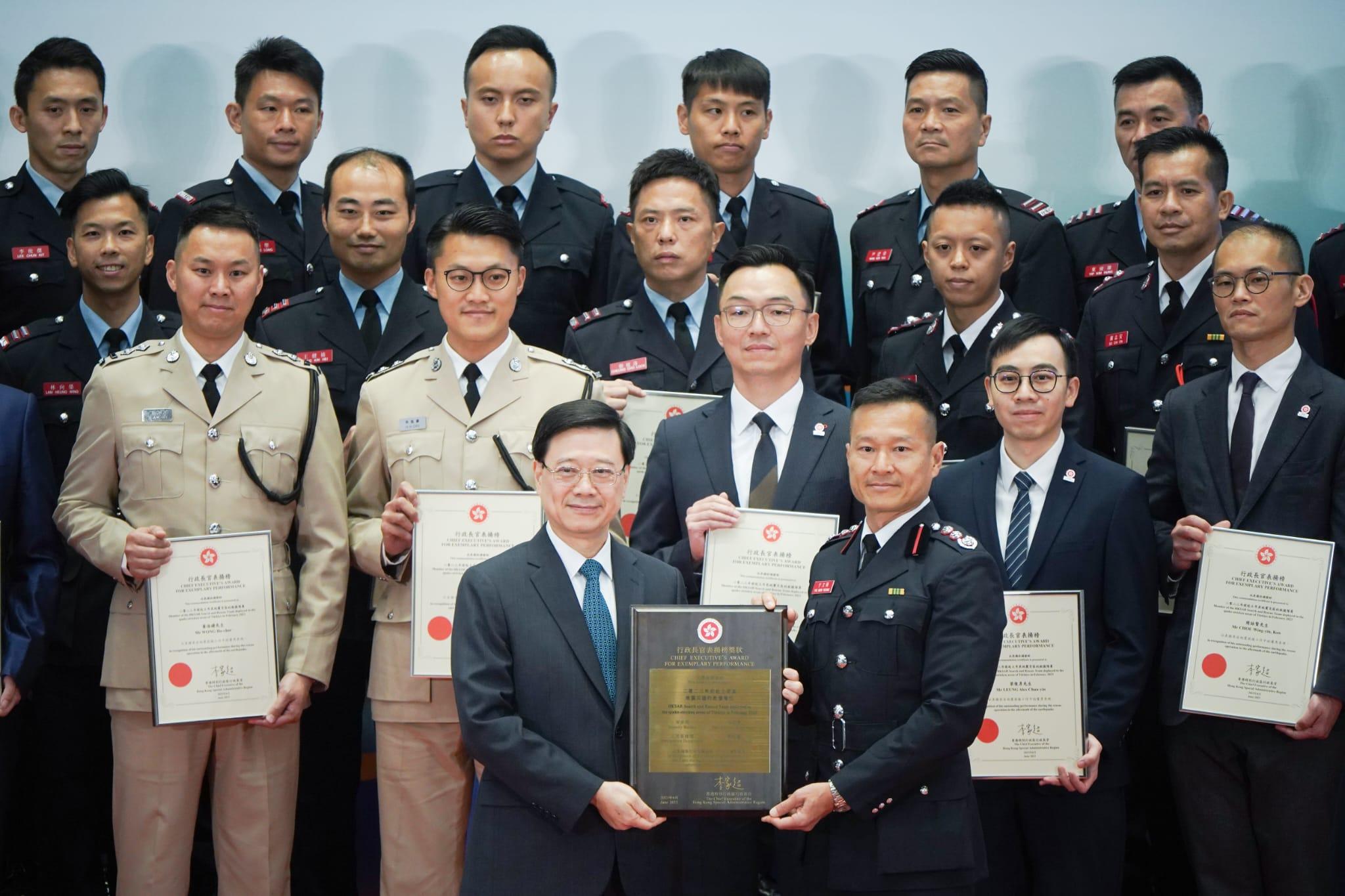 行政長官表揚榜|李家超頒獎表揚特區救援隊,讚揚團隊盡忠職守樹立好榜樣。(李睿哲攝)