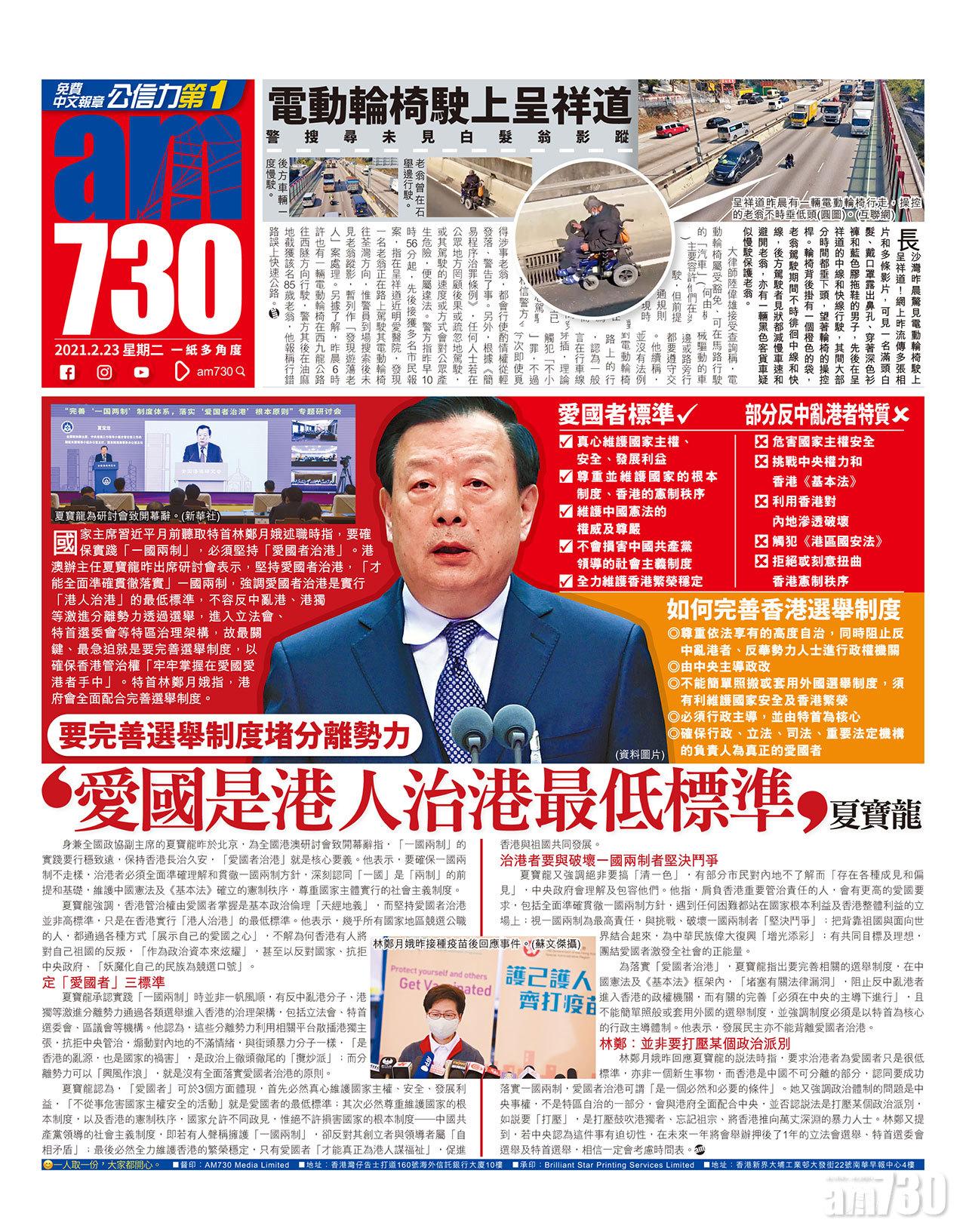 國家主席習近平月前聽取特首林鄭月娥述職時指,要確保實踐「一國兩制」,必須堅持「愛國者治港」。港澳辦主任夏寶龍昨出席研討會表示,堅持愛國者治港,「才能全面準確貫徹落實」一國兩制,強調愛國者治港是實行「港人治港」的最低標準,不容反中亂港、港獨等激進分離勢力透過選舉,進入立法會、特首選委會等特區治理架構,故最關鍵、最急迫就是要完善選舉制度,以確保香港管治權「牢牢掌握在愛國愛港者手中」。特首林鄭月娥指,港府會全面配合完善選舉制度。