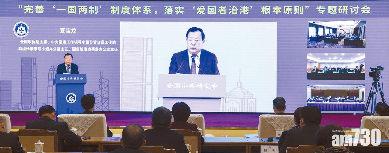 身兼全國政協副主席的夏寶龍昨於北京,為全國港澳研討會致開幕辭指,「一國兩制」的實踐要行穩致遠,保持香港長治久安,「愛國者治港」就是核心要義。他表示,要確保一國兩制不走樣,治港者必須全面準確理解和貫徹一國兩制方針,深刻認同「一國」是「兩制」的前提和基礎,維護中國憲法及《基本法》確立的憲制秩序,尊重國家主體實行的社會主義制度。