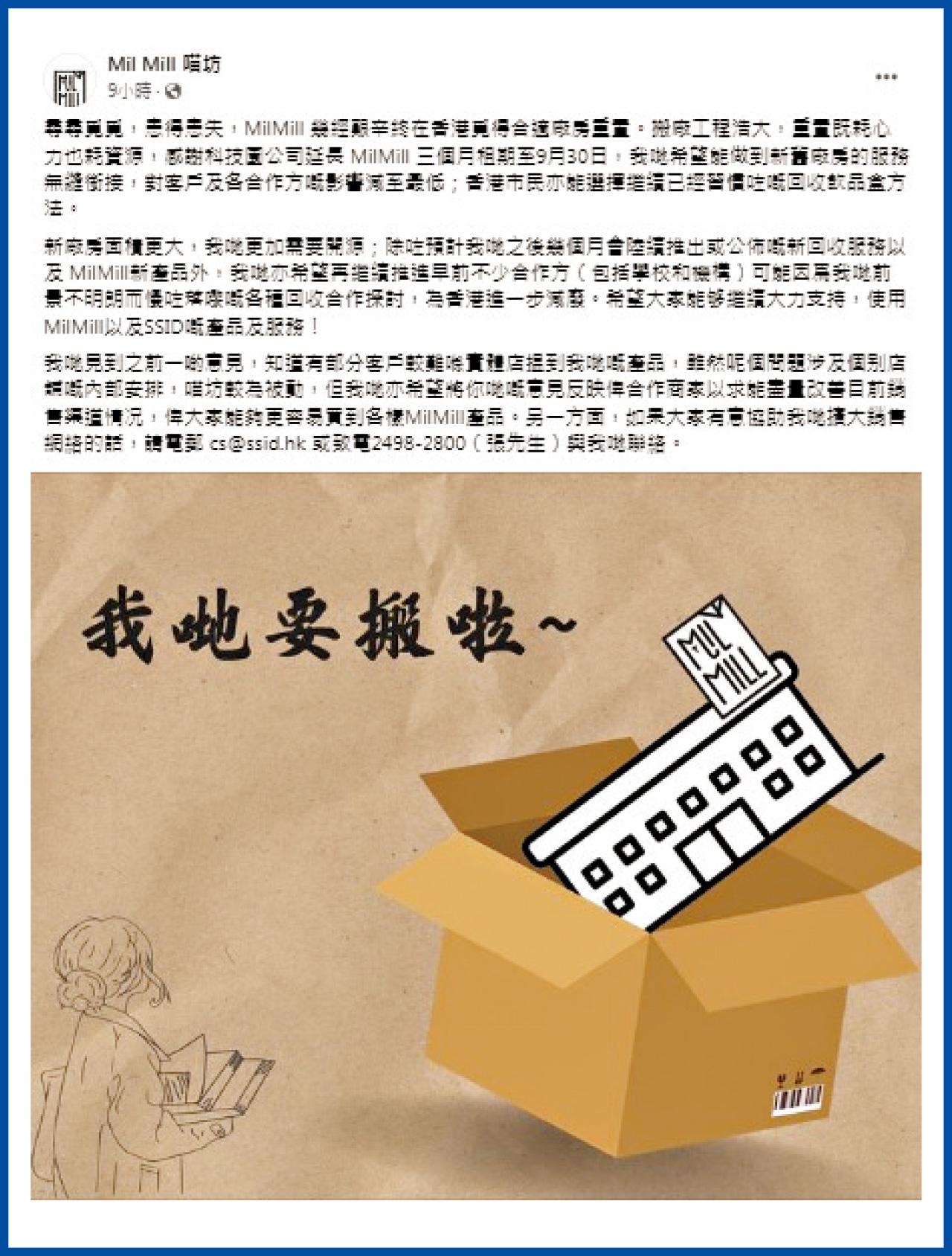 「喵坊MilMill」發文指,「尋尋覓覓,患得患失,MilMil幾經艱辛終在香港覓得合適廠房重置。搬廠工程浩大,重置既耗心力也耗資源,感謝科技園公司延長 MilMil三個月租期至9月30日」。