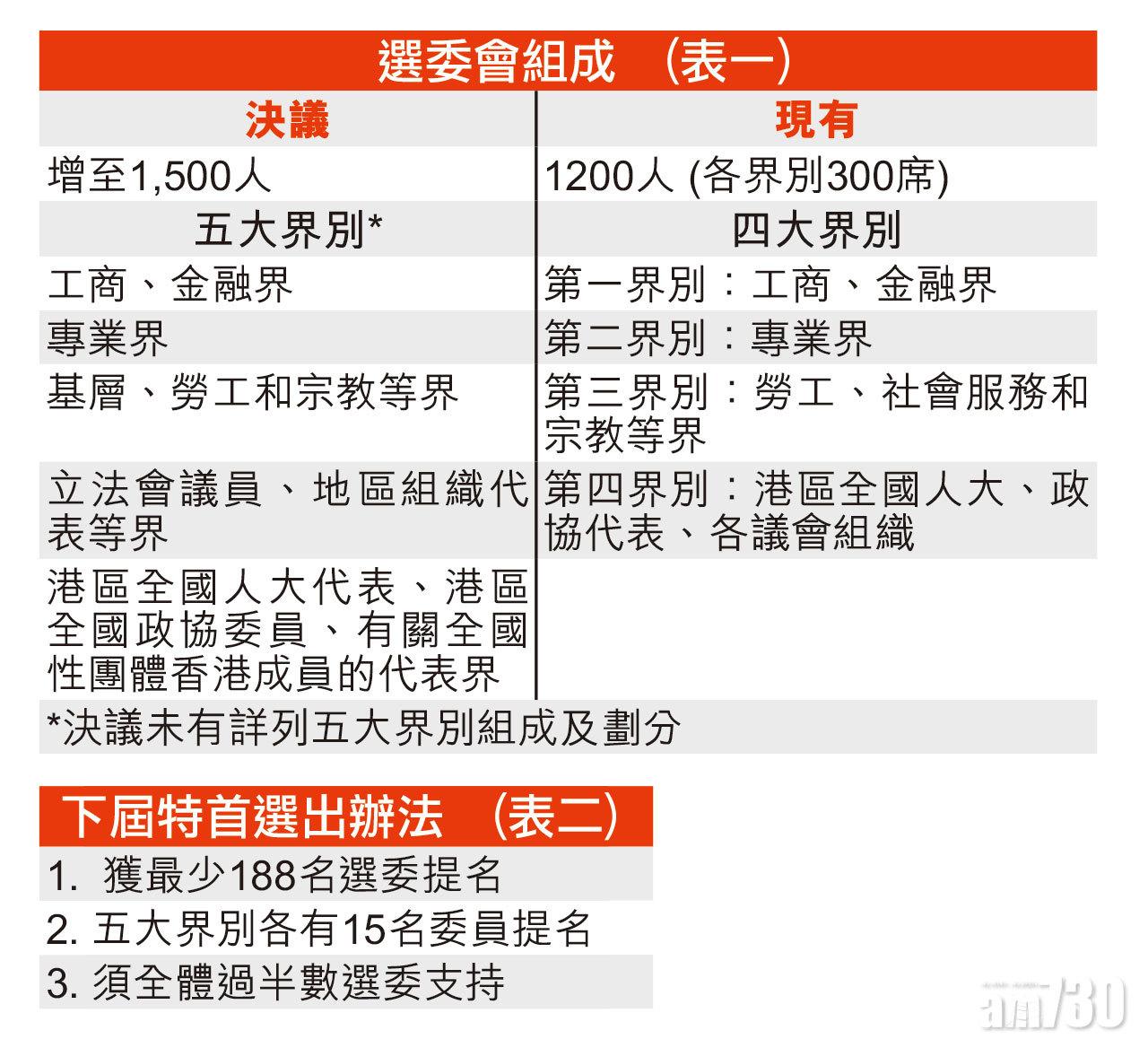 全國人大昨近乎全票通過「完善香港選舉制度」決議,人大常委會將按決議修改《基本法》附件一、二,屆時再由港府修改本地法律。決議將原先選特首的選委會由四大界別修定為五大界別,並增至1,500個委員;而增至90個席位的立法會,亦會新增選委會界別;又將設「資格審查委員會」審查各級選舉的候選人,以確保符合資格。特首林鄭月娥表示港府會全面配合有關修訂,料於12個月內完成修例,並將會率先舉行選委會選舉。