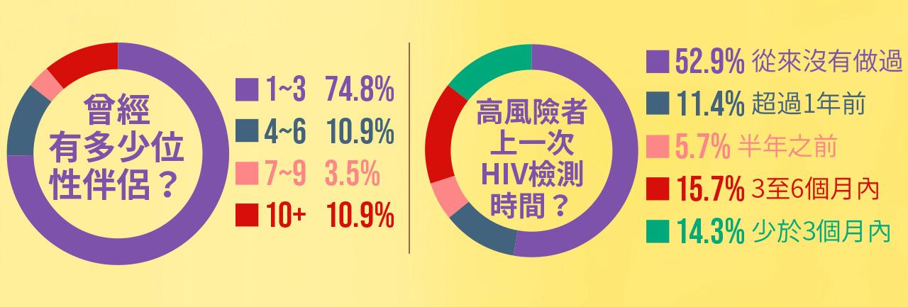 結果發現年輕人性傾向趨多元化,約半數(56.6%)為異性戀;而雙性戀(14.3%)、同性戀(12.8%)及泛性戀(3.8%)合共佔約三成;202名已有性伴侶的受訪者中,四分一曾擁有4個或以上性伴侶,有10個以上亦佔約一成。香港愛滋病基金會服務委員會副主席、感染及傳染病科專科醫生林緯遜指,「逾半數人(52%)進行性行為時僅間歇採用預防措施,16.3%更完全沒有預防措施;性伴侶數目愈多,沒有恆常採取預防措施比例愈高,反映年輕人對安全性行為意識薄弱,令感染HIV風險增加。」73.8%有性經驗的受訪者未曾進行HIV檢測,即使風險較高的男男性接觸者、曾光顧性服務、有4名性伴侶或以上等人士,也有64.3%在過去一年沒有做HIV檢測,缺乏定期檢查意識。