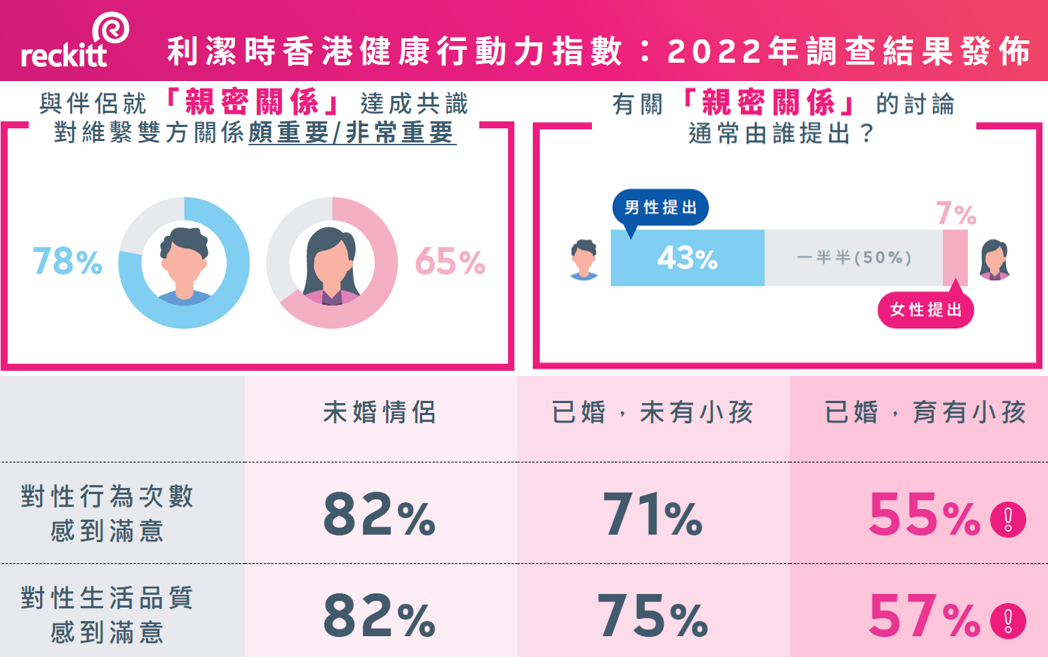 一波又一波的新冠疫情打亂了香港人的生活模式,性生活的滿意度亦受到影響。國際知名快速消費品集團利潔時最新公布的「香港健康行動力指數」調查發現,有三成受訪者認為疫情為自己及伴侶的性生活帶來轉變。而受訪男性在「親密關係」的溝通較女性積極六倍,已婚夫婦則比情侣更易有爭執,對性生活的滿意度大幅下降。