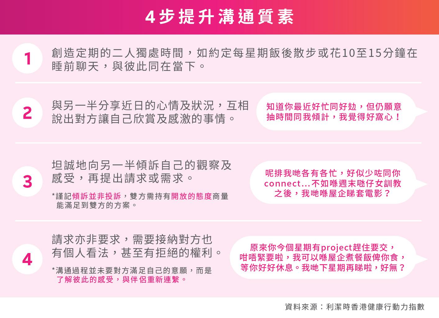 在家工作的安排對已為人父母的夫婦來說是另一個挑戰。每天要同時兼顧工作、家務及育兒等壓力,或會影響夫妻間享受親密時間的安排和心情。Vera表示,在一段親密關係中,善意溝通是維繫雙方親密感的重要一環, 大家可參考以下建議,與另一半定期談談情,說說「性」: