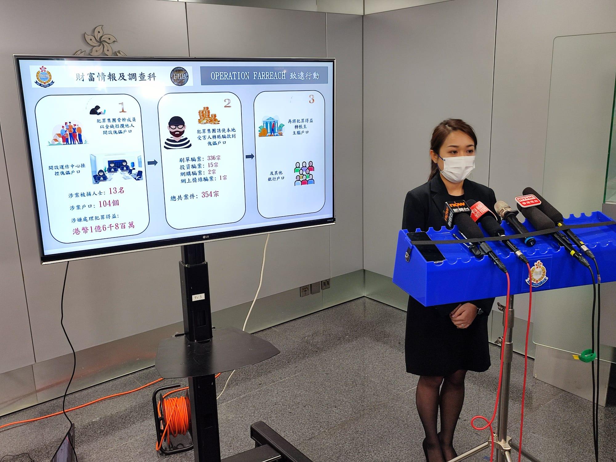 她表示,被捕人士報稱速遞員、建築工人或無業等,該集團今年3月開始營運,共操控104個虛擬銀行戶口,被捕人透過即時通訊軟件及社交平台以金錢作招徠,每個戶口將有500至2,000元不等的報酬,以利誘市民開設傀儡戶口,相關的傀儡戶口主要收取來自刷單、網購、投資、網上情緣騙案等騙款,集團會多次轉帳及提款,以逃避追查,涉及騙案超過345宗,總損失約2,700萬元。其中單一案件涉款最多的為一宗「網上情緣」騙案,案中一名34歲女受害人損失約875萬元。