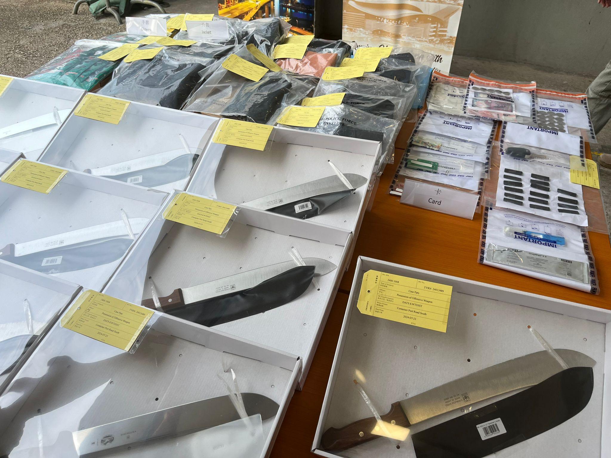 警方昨日在青葵公路透過自動車牌識別系統,發現一輛行車證過期的汽車駛過,隨即截停車輛調查,在車尾箱搜出9把牛肉刀、10件黑色外套、7對防滑手套,同時搜出2張屬於其他人的銀行卡。姓歐女乘客身上則藏有少量可卡因及氯胺酮,姓李男司機正被停牌、未能通過毒駕測試。警方調查後相信該車輛為「黑幫流動武器庫」,用以組織及策劃襲擊行動。