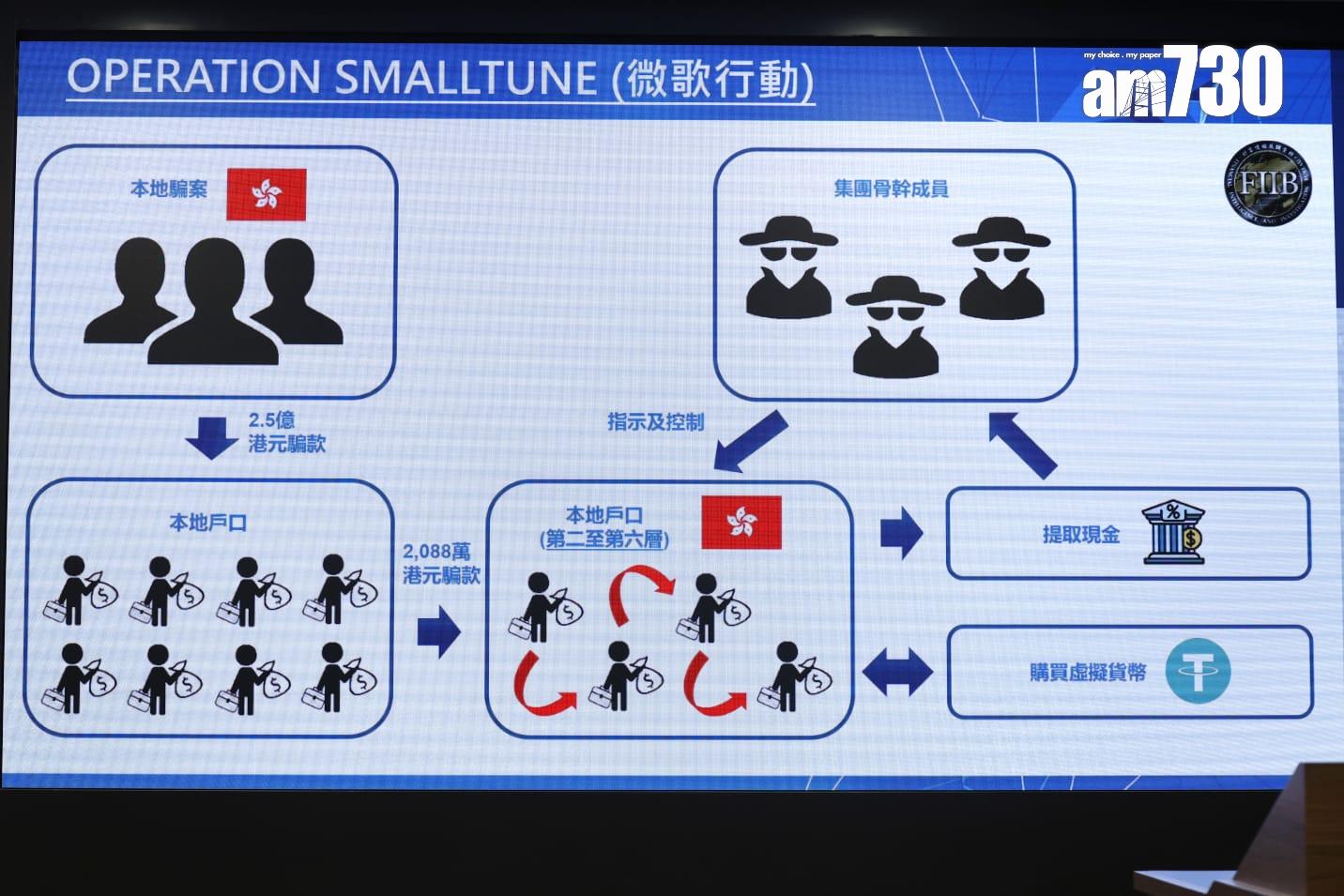 警方表示在今年3月接獲新加坡警方通知,得知當地有30多宗騙案,其中約3,000萬元騙款存入香港的傀儡戶口。香港警方鎖定1個洗黑錢集團,發現集團首腦陪同傀儡到銀行開設戶口,用戶口接收新加坡贓款。集團亦會進行虛擬貨幣交易,清洗犯罪得益,過去1年清洗約1億元。