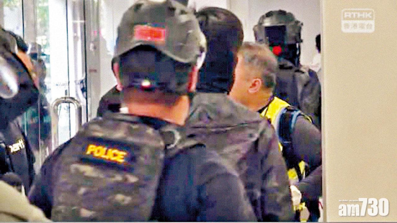 早前警員在直播鏡直前展示一名《立場新聞》記者的身份證。(香港電台截圖)