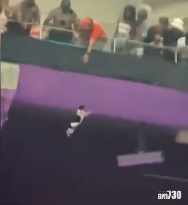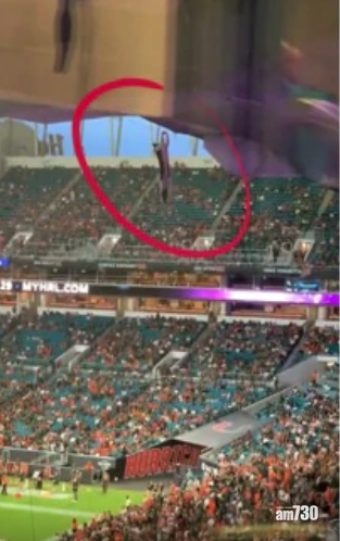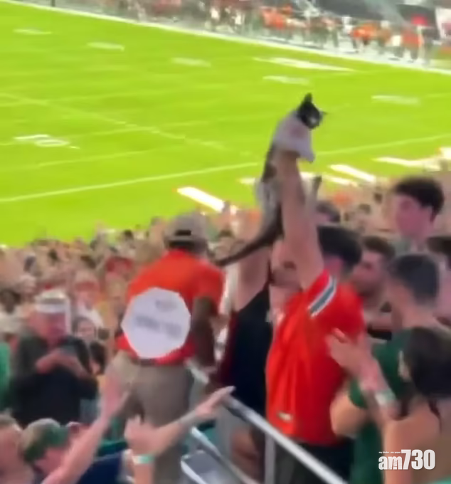 美國邁亞密昨日一場美式足球比賽,全場球迷屏息觀看的並非球賽,而是看台上方半空,皆因一隻貓咪離奇地懸掛在上層看台外的半空中。目擊者稱,貓咪初時兩隻前掌抓著掛在看台外的布邊,之後只剩一隻前掌抓著,快將掉下來。片段可見貓咪驚恐地在半空中爭扎,在場人士看得膽戰心驚,上層看台的人也嘗試抓著牠,惟貓咪最後仍急速墮下,球迷見狀發出尖叫聲。有醒目球迷立即張開手上的美國國旗,雖然最後未能接住貓咪,但牠踫到國旗反彈墮地也減少了衝力,全場球迷見牠獲救都發出歡呼聲。