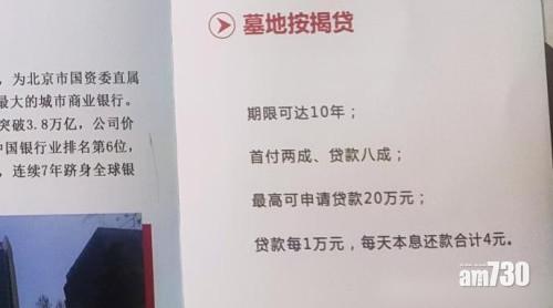 另一邊廂,雲南昆明一個墓園「晉龍如意園」昨宣布與雲南西山北銀村鎮銀行聯合推出「墓地按揭貸」,最高可貸款20萬元,貸款期長達10年,毋須抵押,只要信用記錄良好即可借貸,但貸款人須是墓地使用者的子孫。墓園負責人指,目前昆明每塊墓地平均價格4.5萬至5萬元,但「土地愈來愈少,應該還會繼續上漲,但甚麼時候漲,我們也說不清楚」。負責人還稱,這項舉措「真正實現金融為民、金融便民、金融利民、金融惠民」。