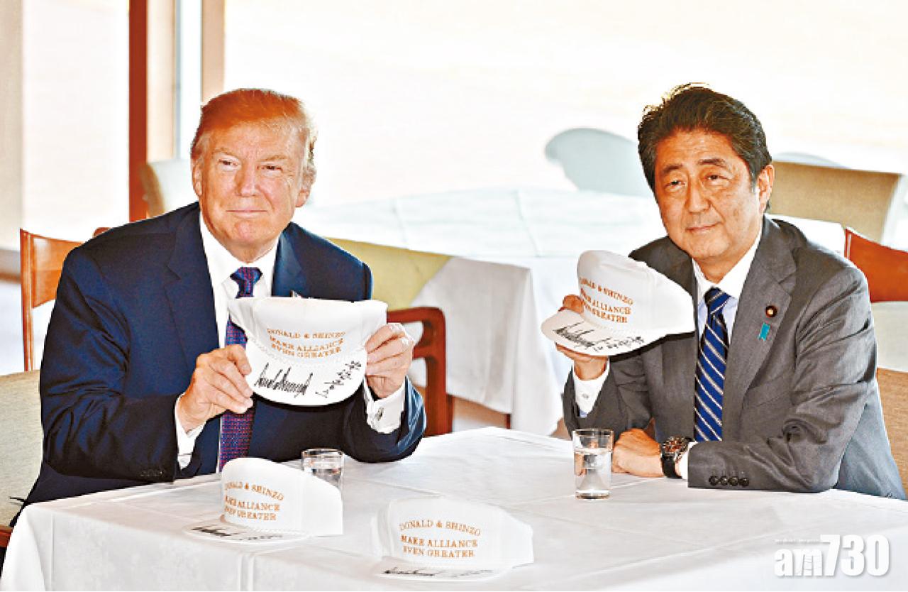 特朗普與安倍打高球前,先交換互相簽名,寫有兩人令美日同盟更偉大字眼的高球帽子。