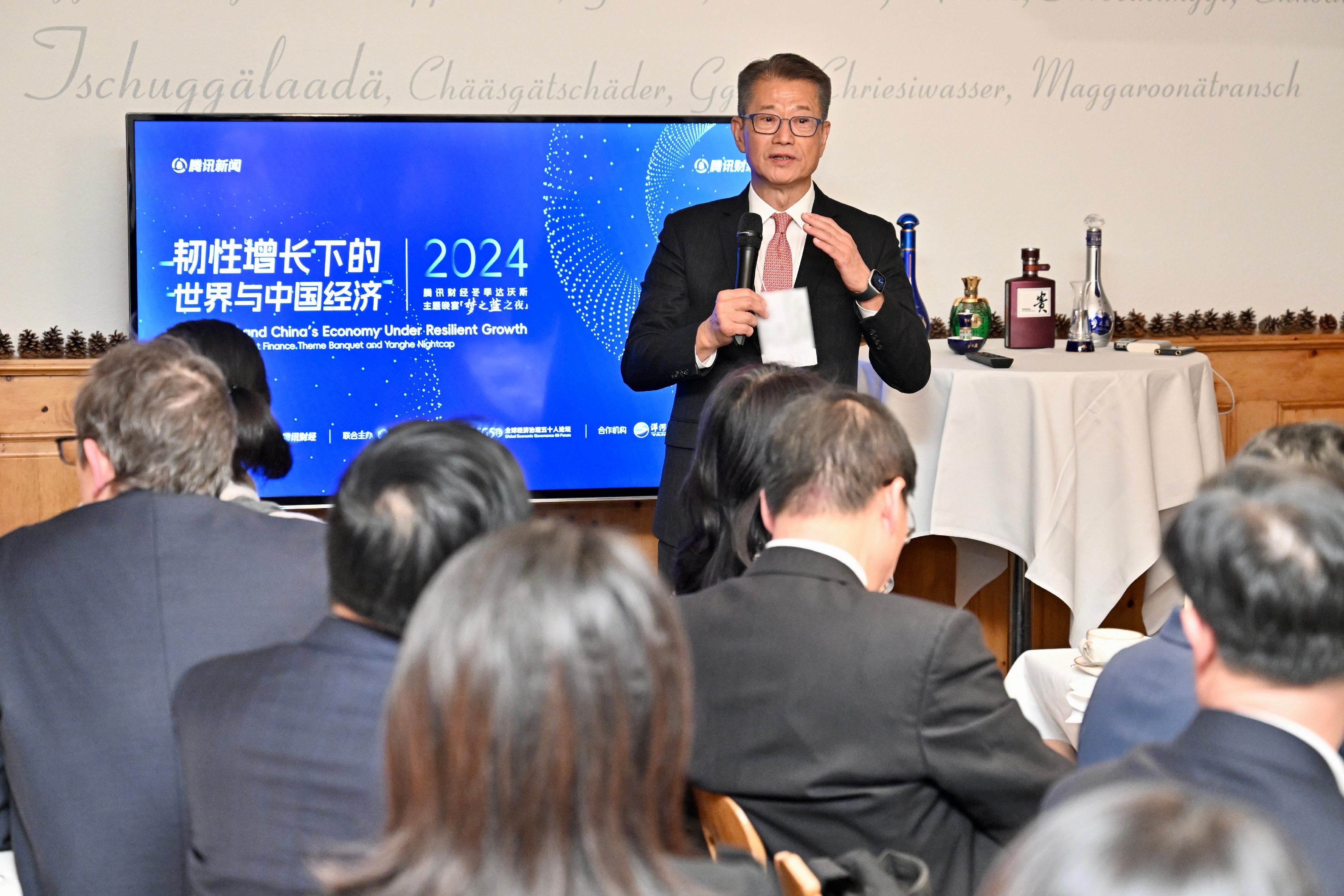 財政司司長陳茂波昨日(達沃斯時間一月十六日)繼續在瑞士達沃斯的訪問行程。圖示陳茂波在騰訊舉辦的「韌性增長下的世界與中國經濟」晚宴上致辭。(政府新聞處圖片)