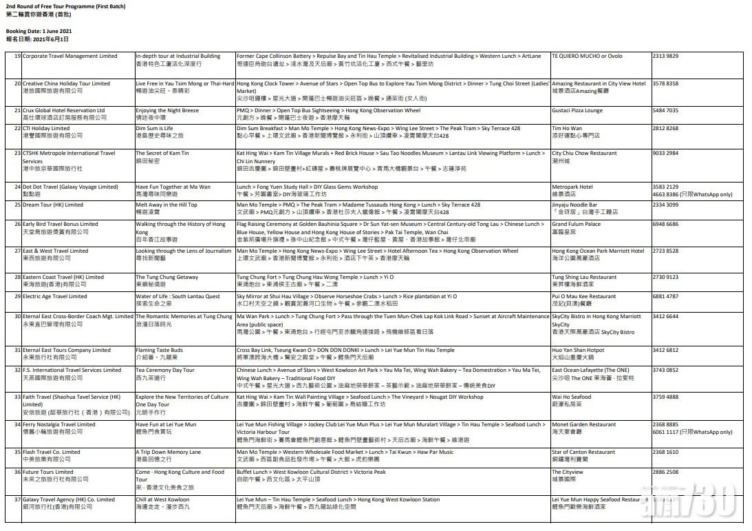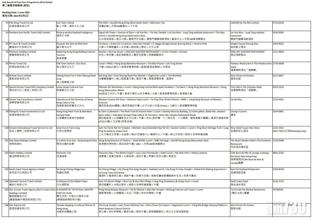 旅發局上周公布推出第二輪「賞你遊香港」,今公布首批約130個行程,有興趣參加市民明日起可直接向相關旅行社報名。