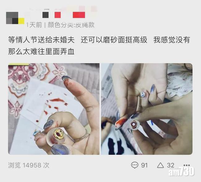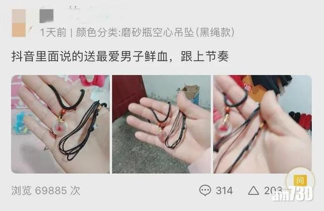 內地傳媒報道,最近特別多年輕女子在抖音、拼多多及淘寶等平台上購買「血吊墜」,她們深信只要在這些賣家聲稱「已開光」的磨砂玻璃小瓶,裝入自己的鮮血後送給男友,就可達到賣家強調的「為男友擋災」效果。有個別賣家銷量超過10萬件,部分還送採血針等「放血」工具。不少買家則在商品評論中展示為用鮮血裝滿小瓶而割手指、甚至割腕的血淋淋畫面,稱「希望他收到能守護他一輩子」。