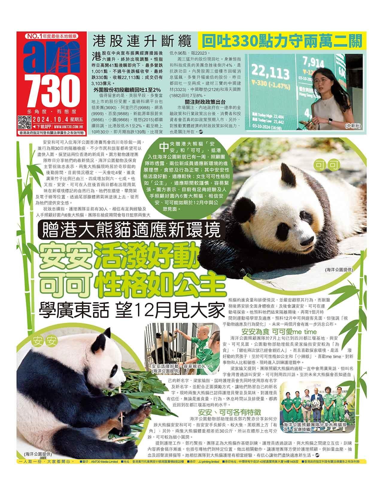 安安和可可入住海洋公園香港賽馬會四川奇珍館一周,進行為期30日的隔離檢疫,不少市民和旅客都希望可以盡快入園,探望這兩位香港的新成員。園方動物護理團隊昨日分享牠們的最新情況,海洋公園動物及保育主管祝效忠表示,兩隻大熊貓現時居於奇珍館的後勤房間,目前情況穩定,一天會吃4餐,進食廣東竹子比例已由三、四成增加到六、七成。他又指,安安、可可在入住後首兩日都有出現用氣味在新環境標記的自然行為,牠們在牆壁、攀爬架及電子磅等位置,透過尾部腺體將氣味塗抹上去,從而為牠們提供安全感。