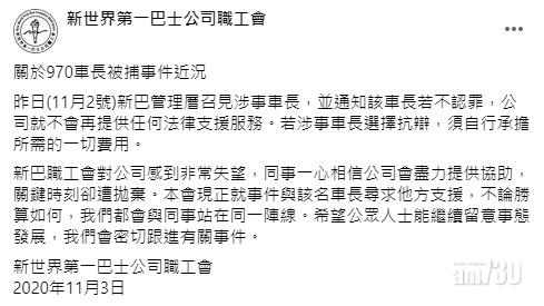 新巴職工會在Facebook發文,指昨日新巴管理層召見涉事車長,並通知他若不認罪,公司就不會再提供任何法律支援服務,又指若他選擇抗辯,須自行承擔所需的一切費用。