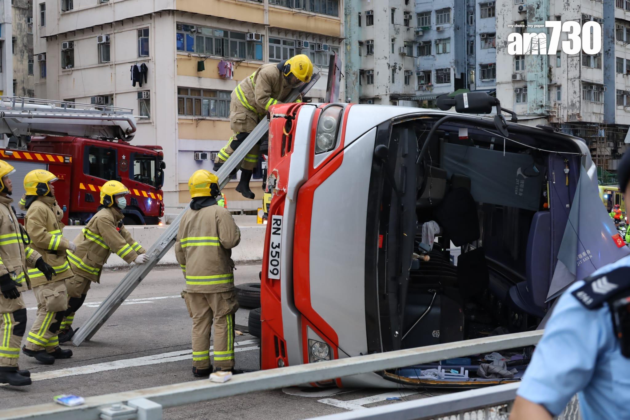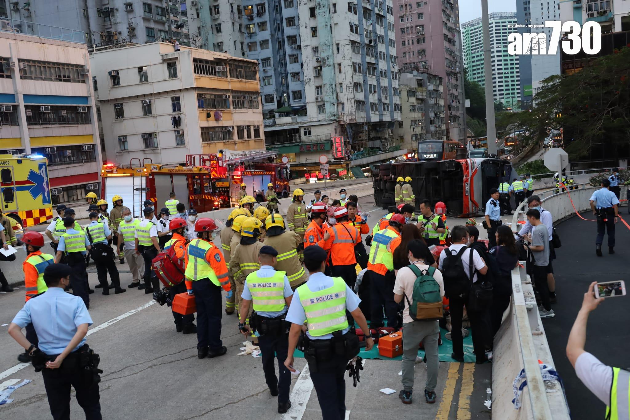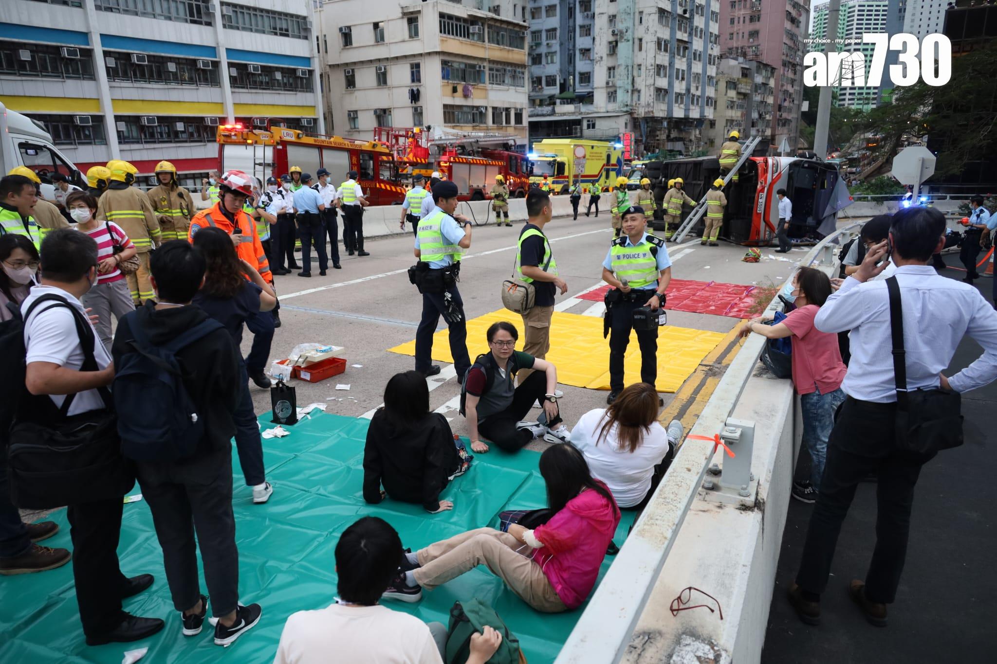 荃灣德士古道天橋旅遊巴翻側至少23人傷。(鍾式明攝)