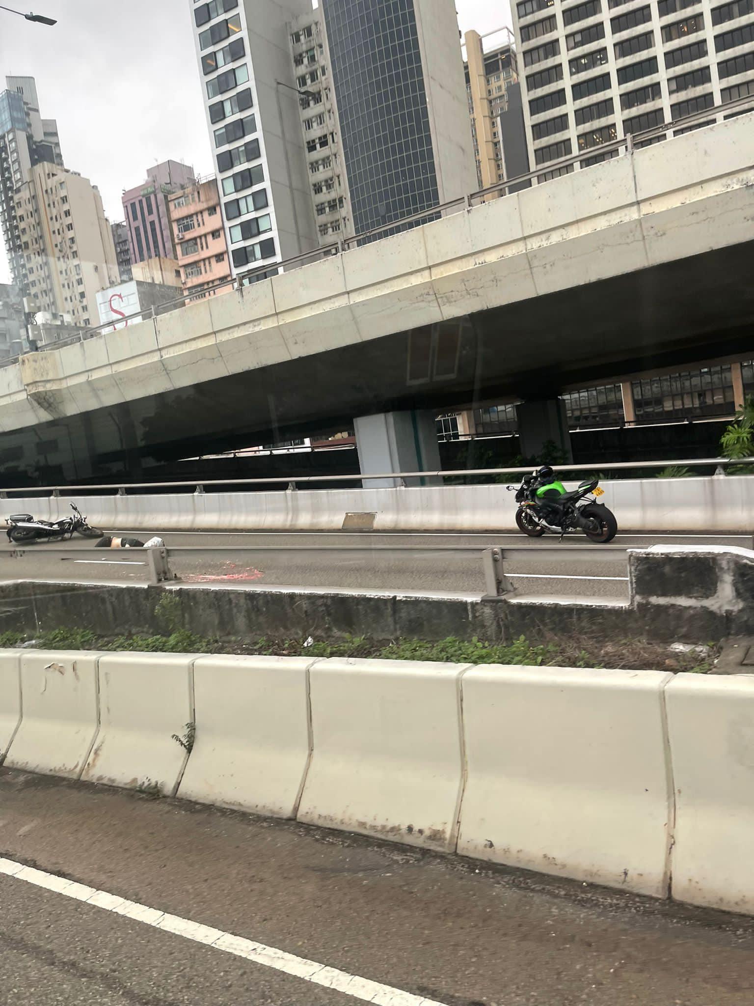 干諾道西天橋東行電單車失事 鐵騎士爆頭重創亡。(fb「香港突發事故報料區」圖片)