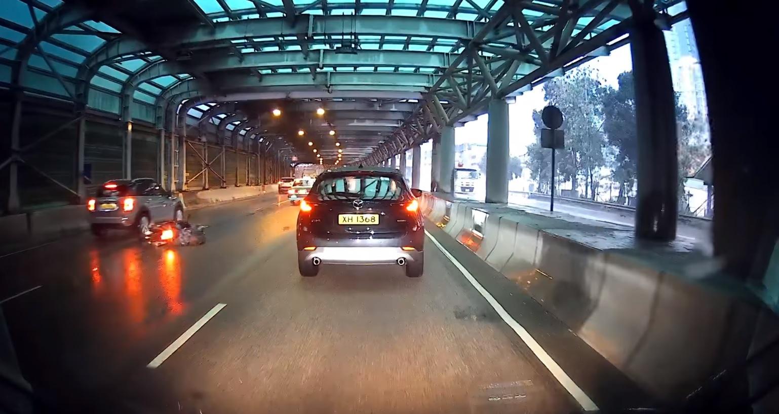 天文台今日凌晨起發出黃色暴雨警告信號,維持約4小時,黃雨懸掛期間於早上7時許,該名鐵騎士於屯門公路往九龍方向、沿慢線行駛行駛,從網上的車Cam片段可見,當電單車駛至近兆康時,前方的私家車收慢,電單車打算從左方切線至中線時,懷疑私家車突然煞停,結果電單車撞私家車左邊車尾,左搖右擺後,連人帶車倒在中線及快線之間,險被後方私家車輾過。警方指事件中無人受傷。