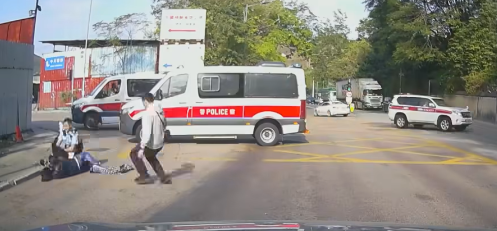 警方接報派警車追截,該車於3部閃燈警車夾擊在路口180度調頭,期間一名男子突然跌出私家車,被多名警員制服,私家車逃離現場。 FB:Lau Kai Chung@車Cam L(香港群組