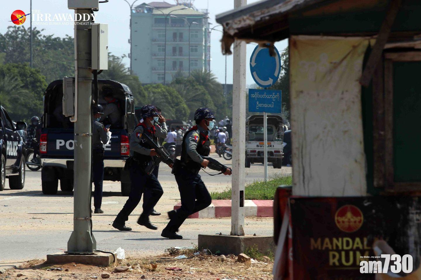 The Irrawaddy照片可見,內比都警察持槍驅散示威者。(互聯網)