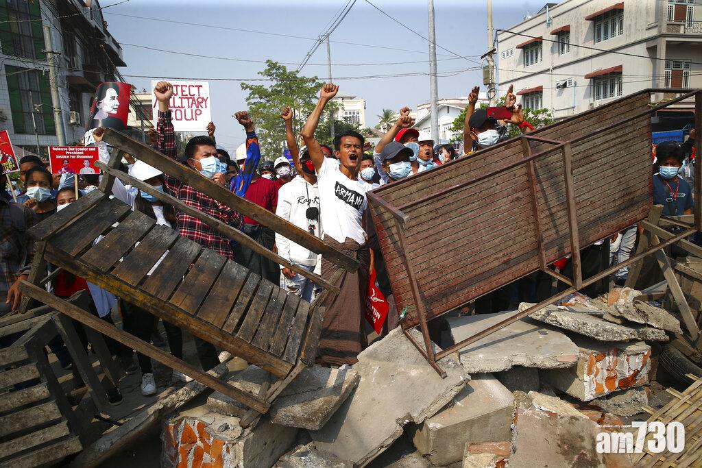 曼德勒示威者用建築材料和雜物設路障。(美聯社)