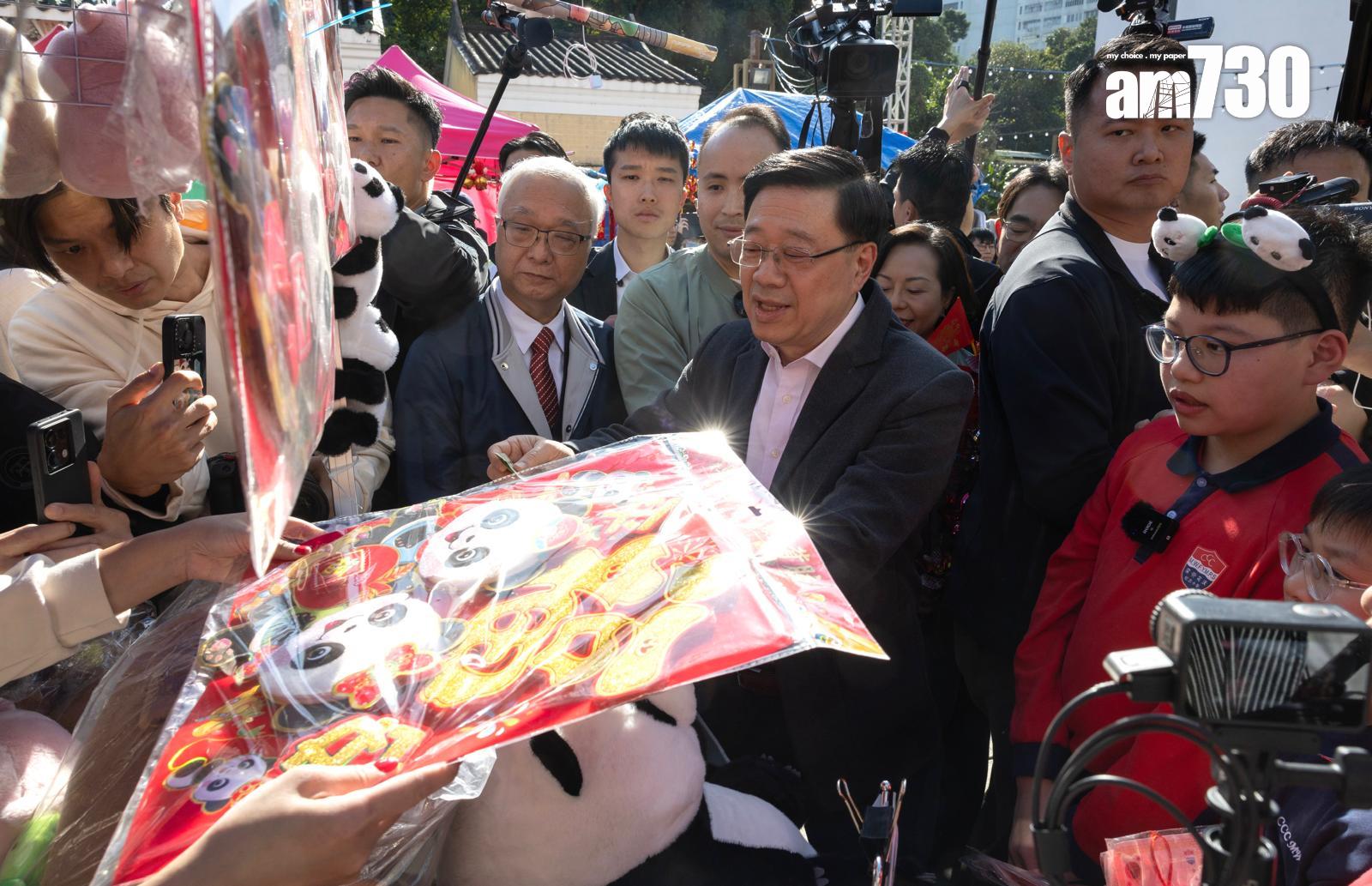 李家超巡視年宵市場後見記者,認為現場喜氣洋溢,留意到有些攤檔生意良好,有些仍在努力,他希望入夜後,更接近新一年,生意會更好。李家超總共消費了350元,包括在檔口買了熊貓產品;買了一紮劍蘭,指寓意奮勇向前;還買了風車,寓意好事連連。他向大家拜早年,希望香港在蛇年會識變、應變、求變。