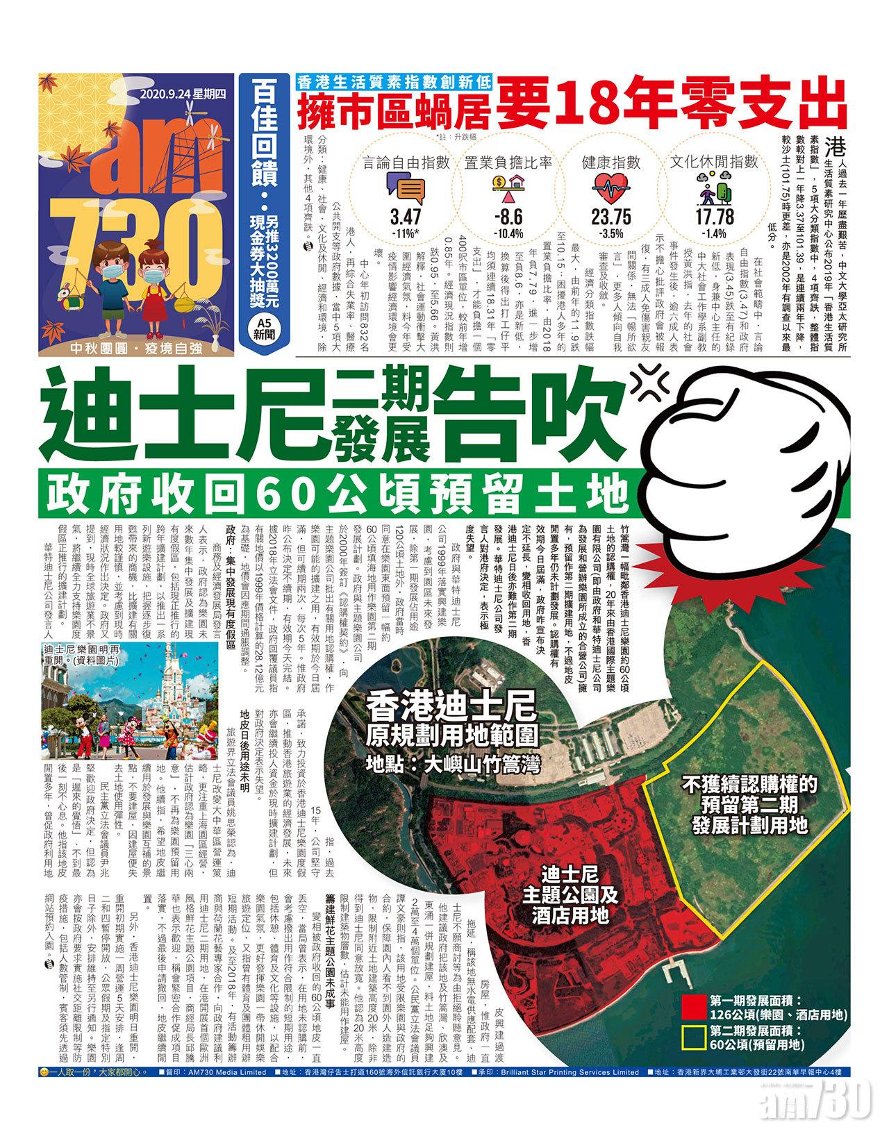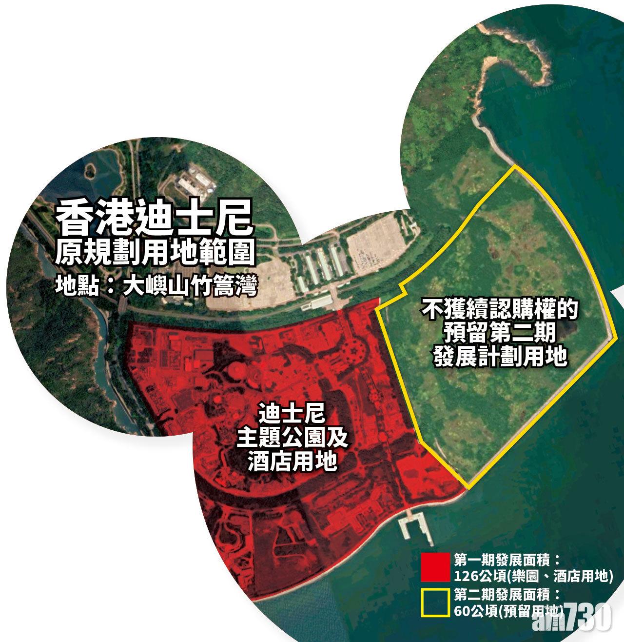 政府與華特迪士尼公司1999年落實興建樂園,考慮到園區未來發展,除第一期發展佔用逾120公頃土地外,政府當時同意在樂園東面預留一幅約60公頃填海地用作樂園第二期發展計劃。政府與主題樂園公司於2000年簽訂《認購權契約》,向主題樂園公司批出有關用地認購權,作樂園可能的擴建之用,有效期於今日屆滿,但可續期兩次,每次5年。惟政府昨公布決定不續期,有效期今天完結。據2018年立法會文件,政府回覆議員指有關地價以1999年價格計算的28.12億元為基礎,地價會因應期間通脹調整。