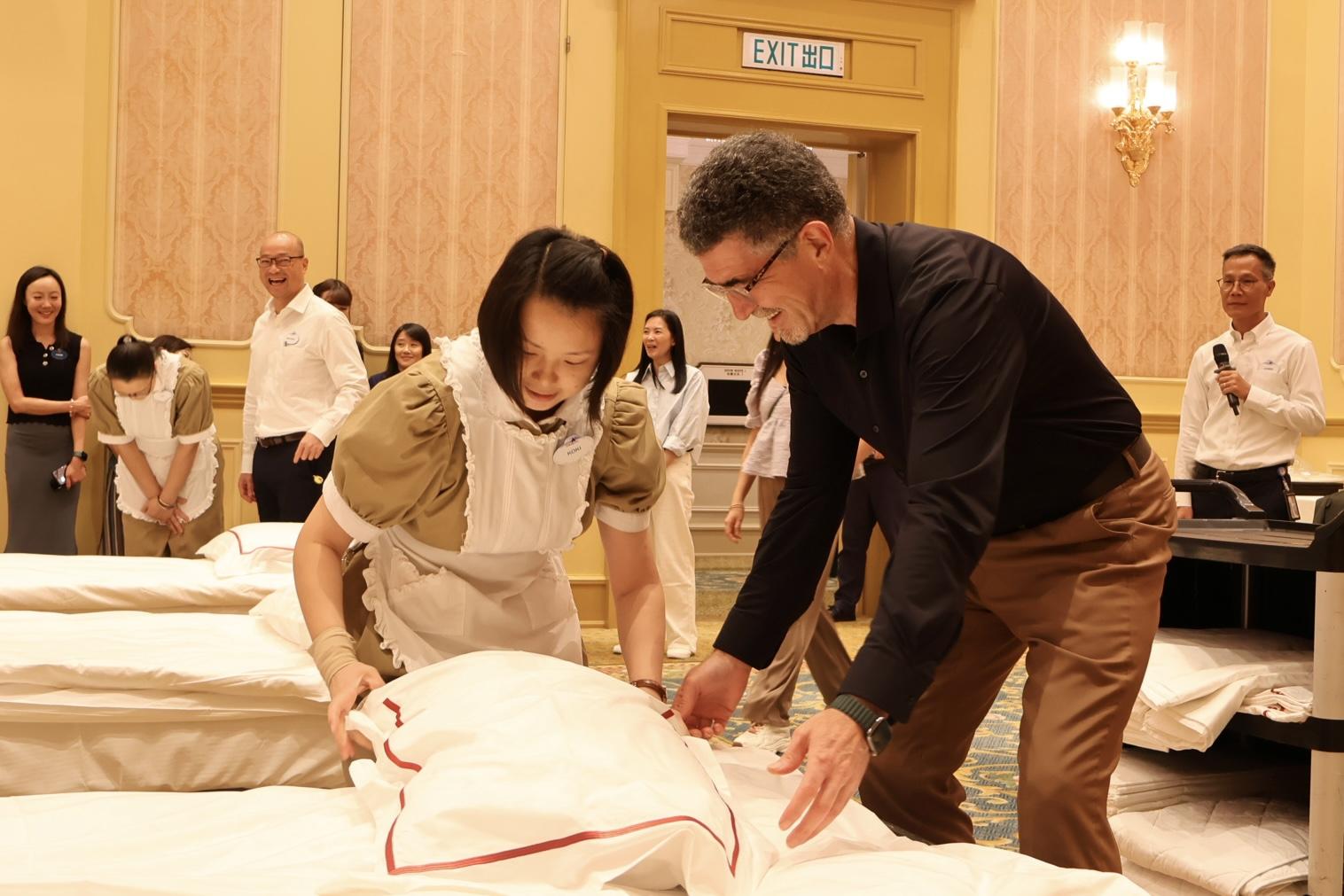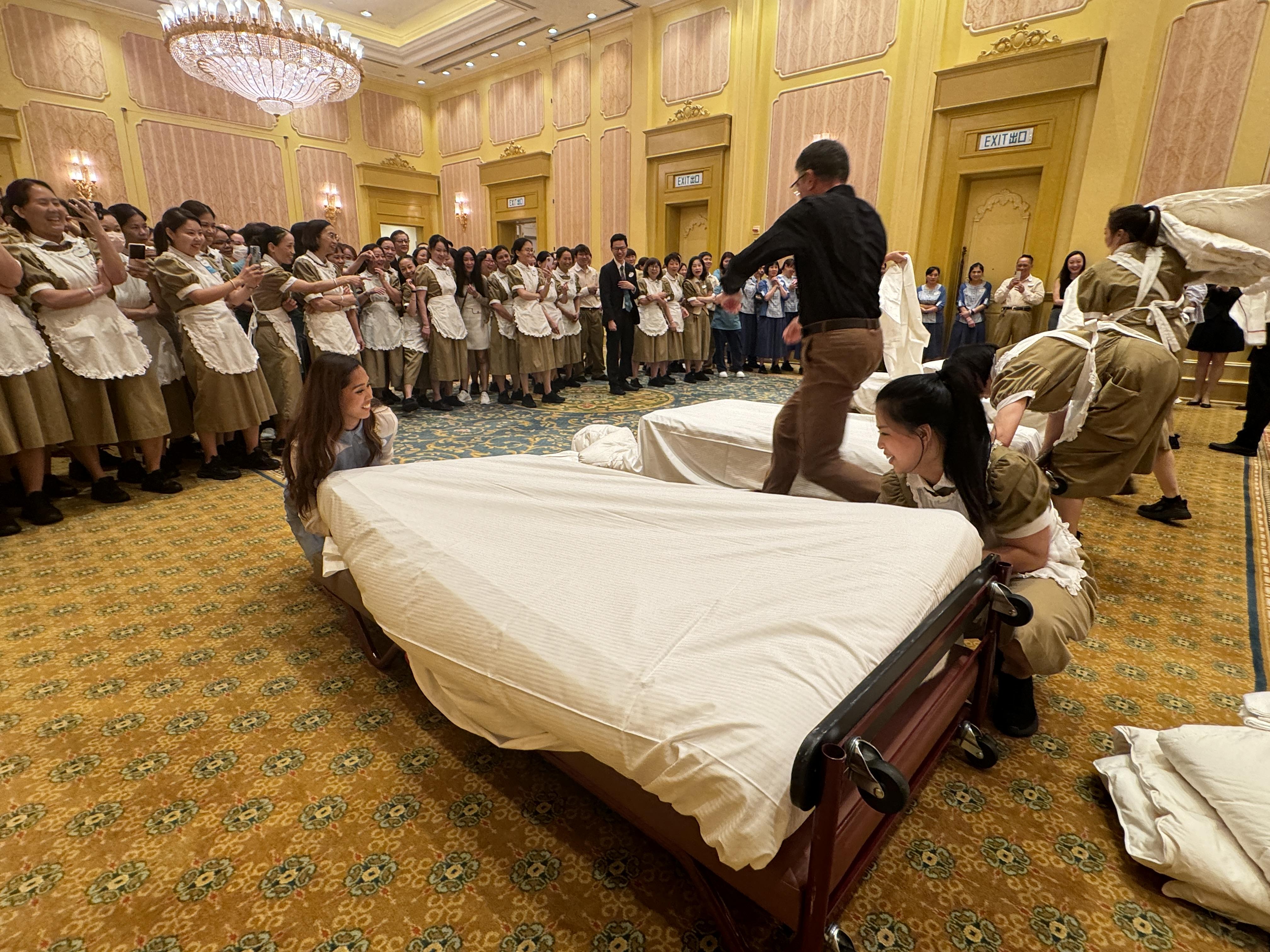 香港迪士尼持續迎來大批旅客,為表揚酒店營運部的管家團隊,香港迪士尼早前在「國際房務周」舉行慶祝活動,今年更舉辦「執床大賽」,讓一眾管家大展身手,一鬥換床單、被單、枕頭套等的功力。