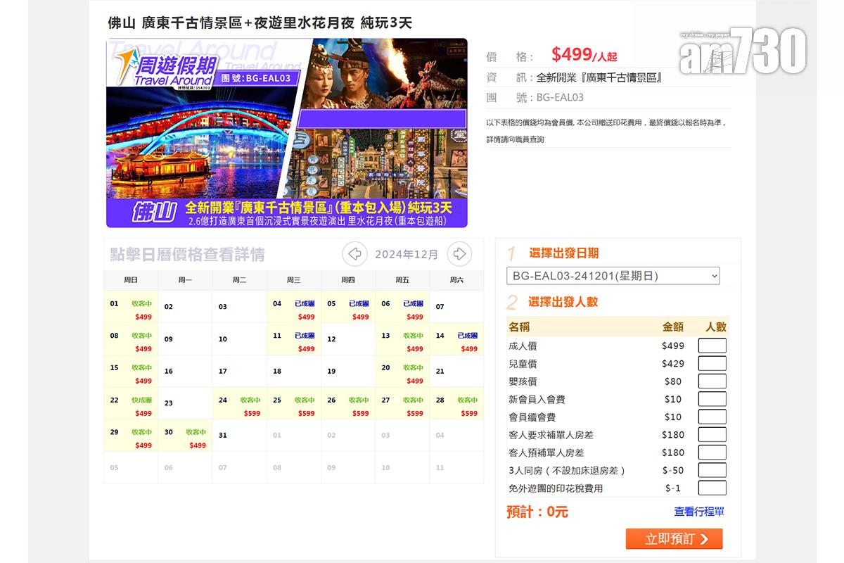 據「周遊假期」網站,涉事的佛山3天團行程包括設有大型實景演出、全新開業的景點「廣東千古情」,以及遊覽廣東首個沉浸式科技光影夜遊演藝遊船。旅行團下月成人價介乎499元至599元,最快下月1日出發。