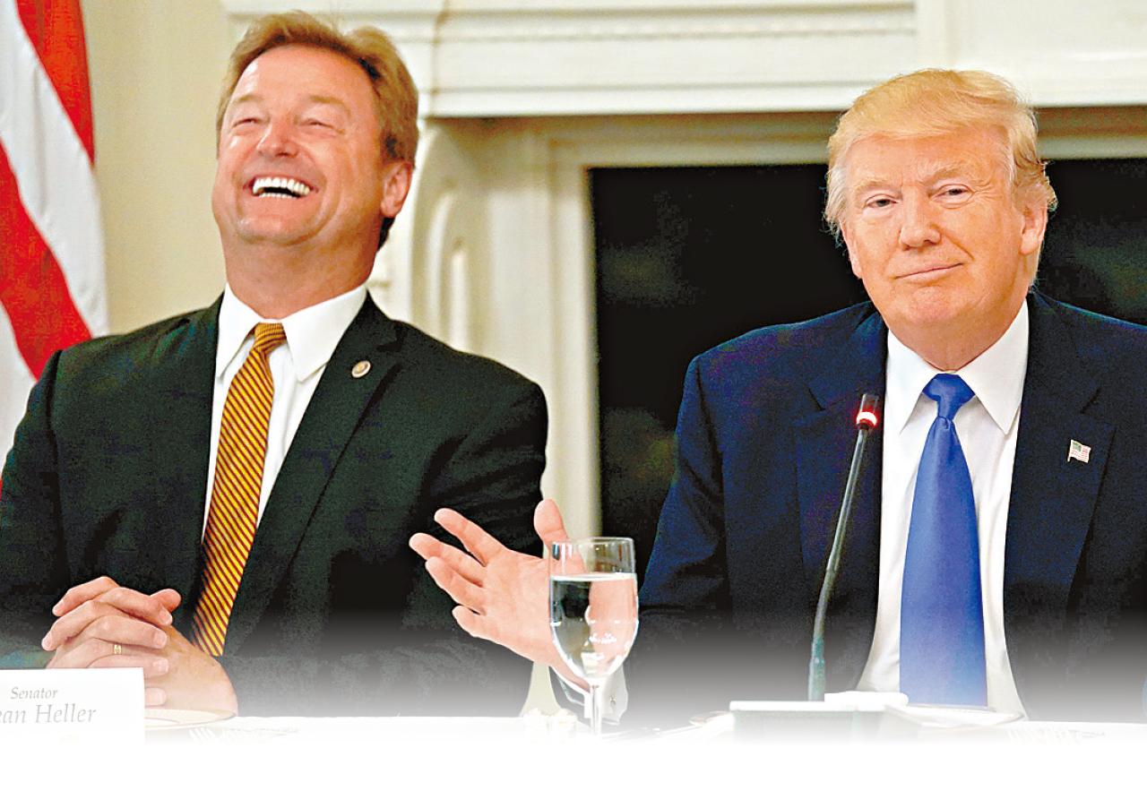 赫勒(左)遭特朗普(右)威嚇,不支持新醫保將會丟掉議席,只能尷尬大笑。(路透社)