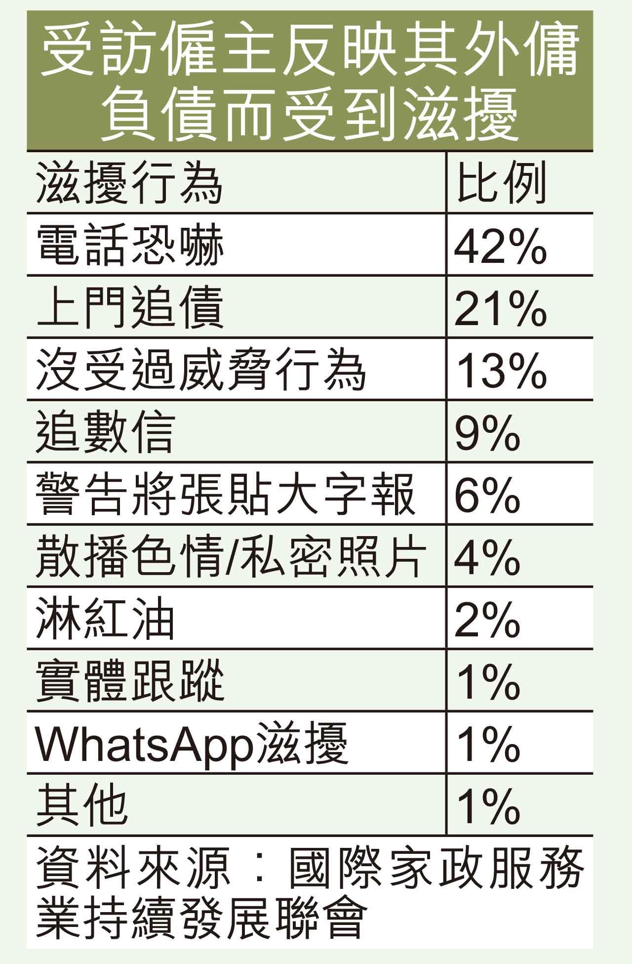 聯會會長林夏瑤表示,外傭借貸問題近期愈趨嚴重,部分近乎失控。不少外傭須借貸來港,甚至形成「以債養債」的惡性循環。到無力再借償還下,僱主亦成受滋擾的對象,72%僱主會曾因此被滋擾,包括遭電話恐嚇及上門追債、潑紅油及跟蹤等。