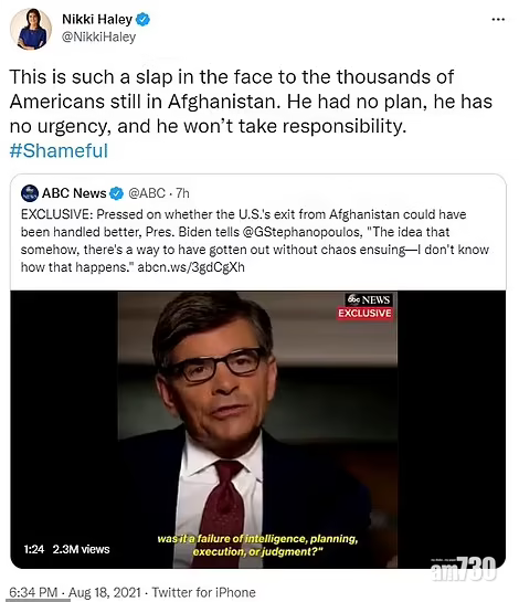 主持人George Stephanopoulos問拜登,有否認為撤離可以做得更好,沒有出錯。拜登回答,他並不認為可以在無混亂下進行,「我不知道如何可這樣」。他認為阿富汗安全部隊要為喀布爾快速淪陷負責,「當你有這樣的政府、這樣的領導人,只顧乘飛機逃離,到其他國家去;當你見到我們訓練的阿富汗部隊,他們多達30萬人,只懂棄械和逃離,所以發生這樣的事」。