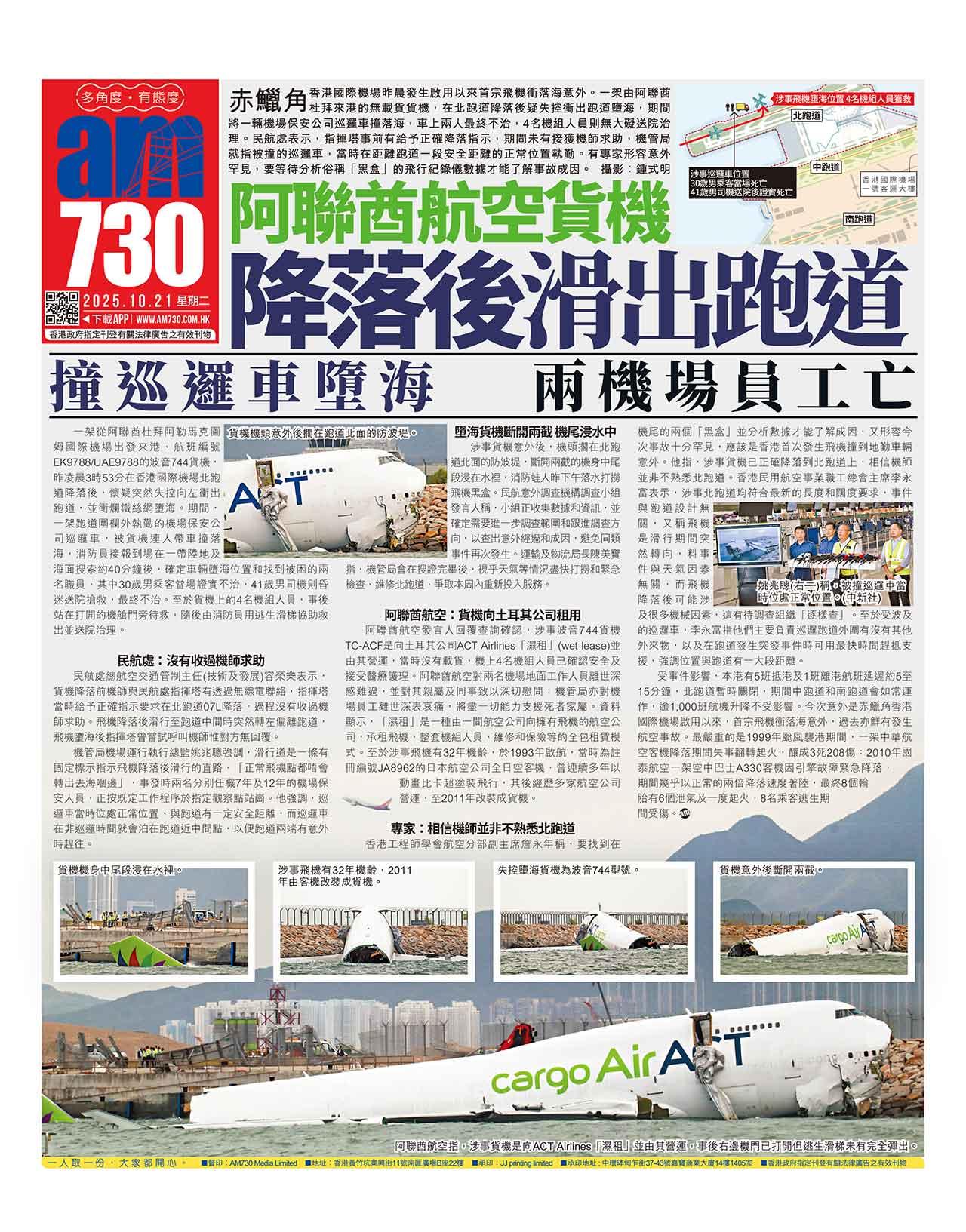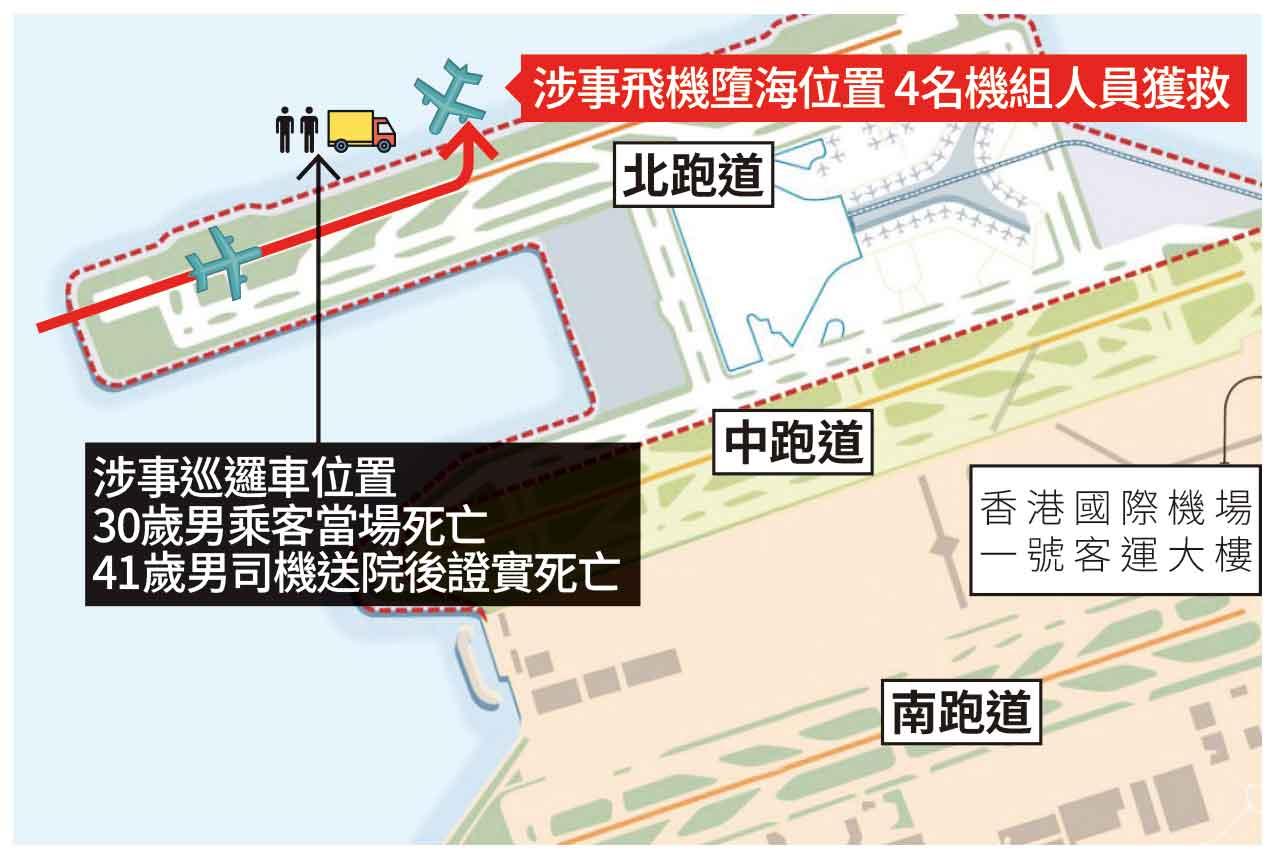 一架從阿聯酋杜拜阿勒馬克圖姆國際機場出發來港、航班編號EK9788/UAE9788的波音744貨機,昨凌晨3時53分在香港國際機場北跑道降落後,懷疑突然失控向左衝出跑道,並衝爛鐵絲網墮海。期間,一架跑道圍欄外執勤的機場保安公司巡邏車,被貨機連人帶車撞落海,消防員接報到場在一帶陸地及海面搜索約40分鐘後,確定車輛墮海位置和找到被困的兩名職員,其中30歲男乘客當場證實不治,41歲男司機則昏迷送院搶救,最終不治。至於貨機上的4名機組人員,事後站在打開的機艙門旁待救,隨後由消防員用逃生滑梯協助救出並送院治理。