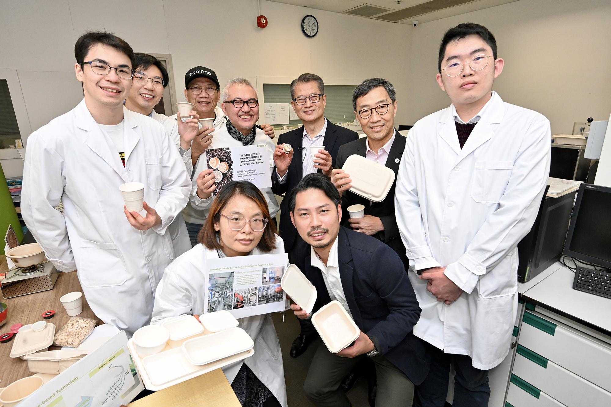陳茂波昨參觀科學園,圖為園內一間專注研發新環保物料餐具的初創企業。