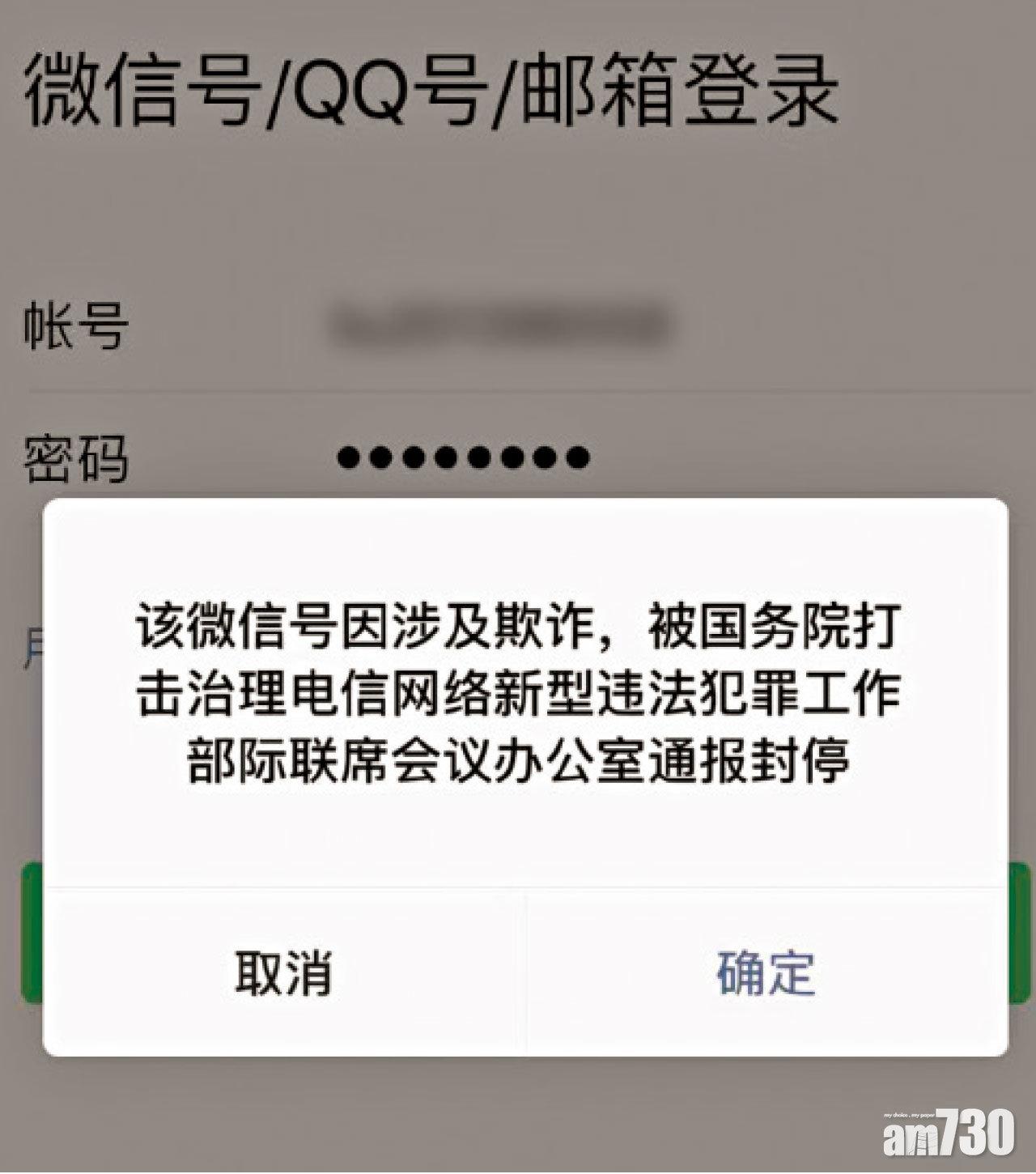 公安部刑事偵查局周二發通告,指由於中緬邊境地區電信網絡詐騙犯罪活動猖獗,遂自周一起查封緬甸北部相關情況嚴重地區的QQ、微信及支付寶等帳號,若因「技術原因」封錯帳號,民眾可聯絡雲南普洱市公安局。
