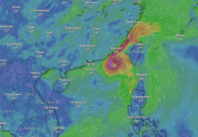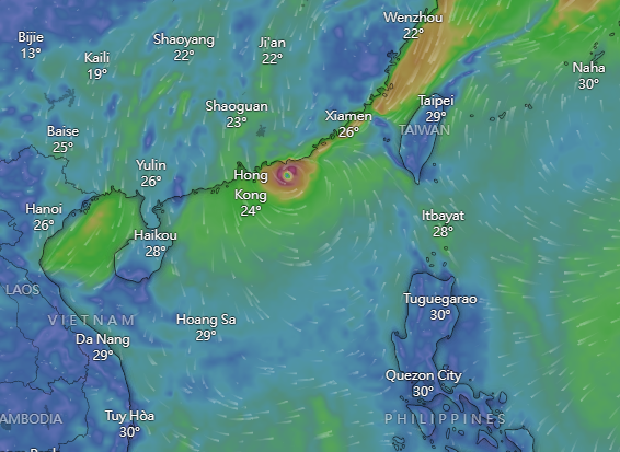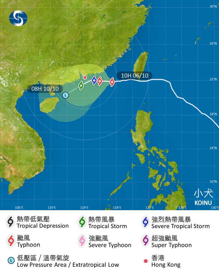 天文台指,小犬的環流緊密,並繼續以颱風強度穩定地向偏西方向移動,靠近珠江口一帶。本港普遍地區將逐漸吹強風,高地間中吹烈風。預料受小犬及東北季候風共同影響,本港明日至星期日風勢會進一步增強,部分地區尤其南部可能吹烈風。