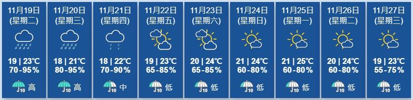 天文台展望明日間中有雨,天氣仍然較涼。星期四風勢緩和。(香港天文台)